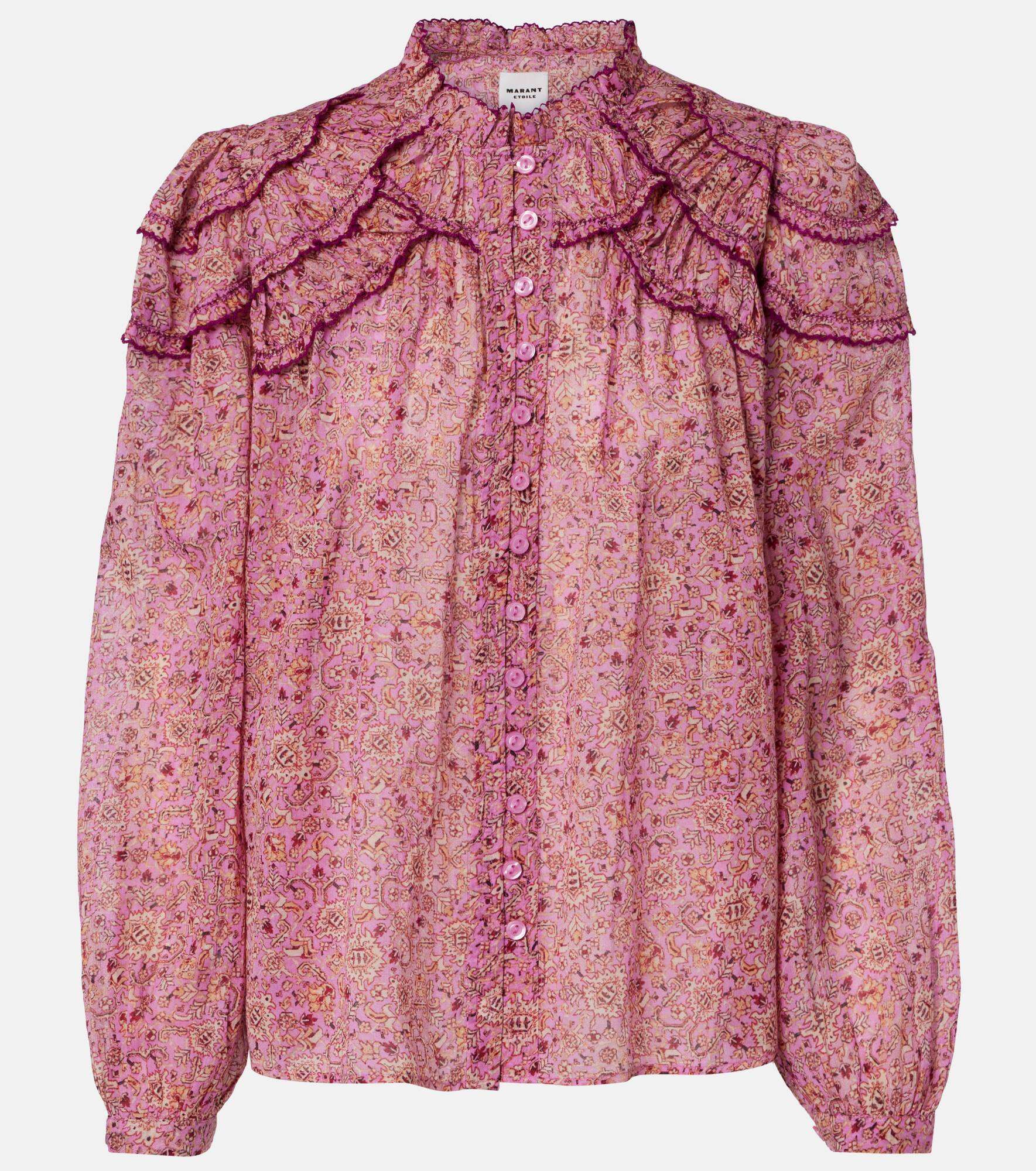 Add a touch of Parisian romance to your wardrobe with the Christa blouse by Marant Etoile. Crafted from organic cotton with a charming print, this piece features delicate ruffles at the shoulders and a buttoned front closure. Product Details - Material: 100% cotton (organic) - Care instructions: machine wash at 30 degrees - Made in India - Designer color name: Pink - Item color: pink, multicolor - Embroidery: 100% polyester - Closure: buttoned front - Collar: mockneck - Cuff: one button - Item number: P01074527 Size & Fit - True to size - Designed for a loose fit - Non-stretchy fabric - Falls to the hip - The model seen in the picture is 178cm-5'10" and wearing a size FR 36