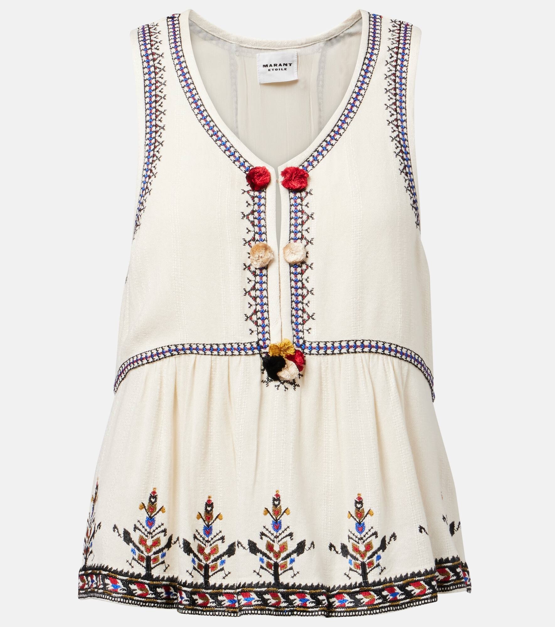 Hailing from Paris, Marant Etoile captures the art of French nonchalance through breezy yet polished staples. This top is cut to a relaxed silhouette with wide armholes and an embroidered design. Product Details - Material: 100% viscose - Care instructions: dry clean - Made in India - Designer color name: Ecru - Item color: white - Lining: 100% viscose - Embroidery: 100% viscose - Item number: P01052850 Size & Fit - True to size - Cinched waist - Non-stretchy fabric - Falls to the hip - The model seen in the picture is 178cm-5'10" and wearing a size FR 36