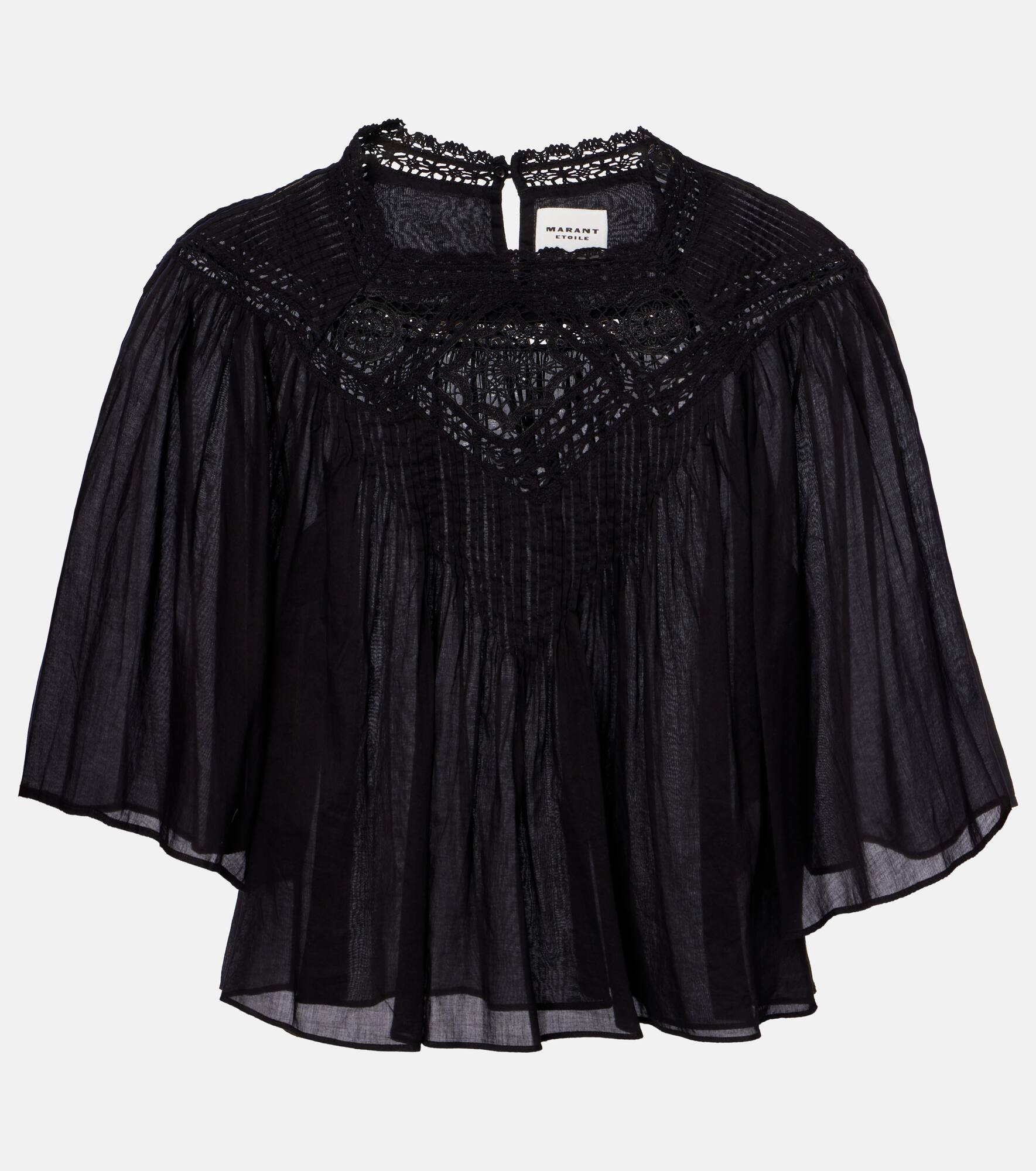 The Garia blouse by Marant Etoile is crafted from cotton and adorned with delicate lace trim. This piece is designed with a flared silhouette featuring a buttoned slit at the back, and short, loose sleeves. Product Details - Material: 100% cotton - Care instructions: machine wash at 30 degrees - Made in India - Designer color name: Black - Item color: black - Lace: 100% cotton - Embroidery: 100% polyester - Item number: P01074595 Size & Fit - True to size - Semi-sheer - Designed for a loose fit - Non-stretchy fabric - Falls to the hip - The model seen in the picture is 178cm-5'10" and wearing a size FR 36