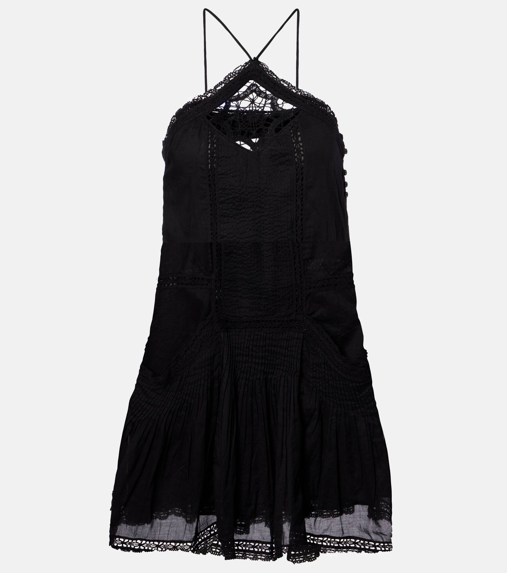 Hailing from Paris, Marant Etoile captures the art of French nonchalance through breezy yet polished staples.The Geraldin sleeveless minidress is crafted from lightweight cotton, featuring delicate lace trims and a flattering halter neckline. Product Details - Material: 100% cotton (organic) - Care instructions: dry clean - Made in India - Designer color name: Black - Item color: black - Trim: 100% cotton (organic) - Lining: 100% viscose - Embroidery: 100% polyester - Closure: button fastening - Fully lined - Item number: P01074535 Size & Fit - True to size - Semi-sheer - Cinched waist - Non-stretchy fabric - The model seen in the picture is 178cm-5'10" and wearing a size FR 36