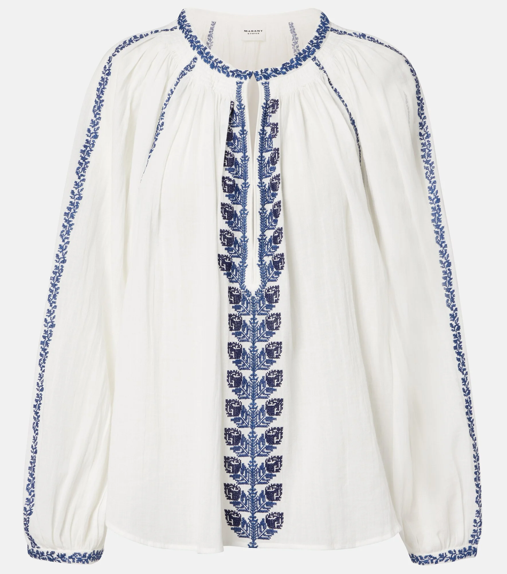 Hailing from Paris, Marant Etoile captures the art of French nonchalance through breezy yet polished staples. Made from pure cotton, the Lena blouse features a long-sleeved design with voluminous sleeves and delicate embroidery throughout. Product Details - Material: 100% cotton (organic) - Care instructions: hand wash - Made in India - Color: white - Designer color name: Ecru/Blue - Material II: 100% cotton - Lining: 100% cotton - Embroidery: 100% viscose - Closure: hook fastening - Item number: P01132216 Size & Fit - True to size - Designed for a loose fit - Non-stretchy fabric - Falls below the hip - The model seen in the picture is 178cm-5'10" and wearing a size FR 36