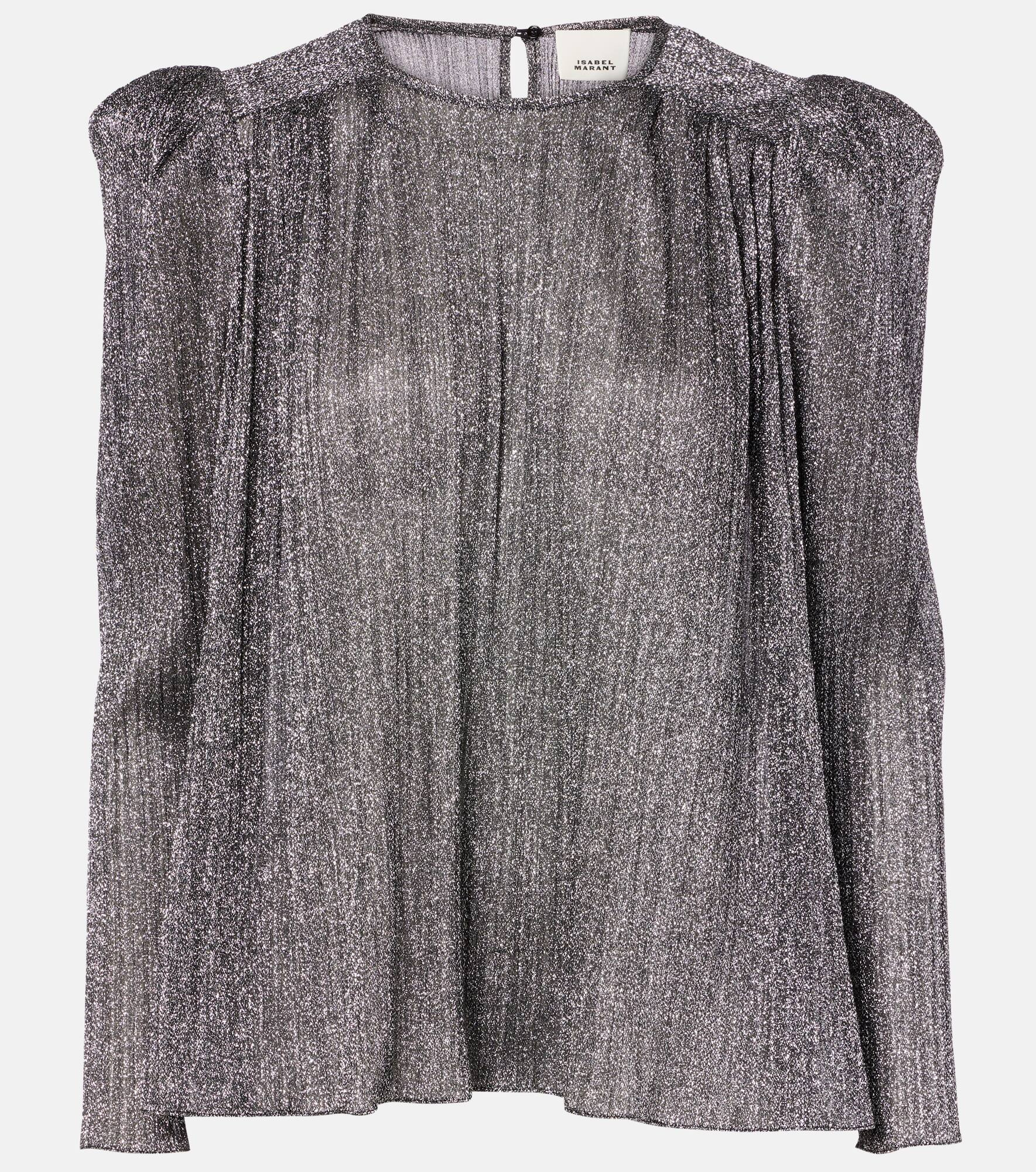 Isabel Marant has earned a devoted following for its relaxed, inclusive, and effortlessly authentic style. The long-sleeved Elya top features pleats and a shimmering finish for a touch of glamour. Product Details - Material: 75% polyester, 25% metallic fibres - Care instructions: dry clean - Made in Romania - Designer color name: Silver - Item color: silver - Details: 100% silk - Closure: buttoned back - Item number: P01108859 Size & Fit - True to size - Oversized shoulders - Designed for a loose fit - Slightly stretchy fabric - Falls to the hip - The model seen in the picture is 178cm-5'10" and wearing a size FR 36