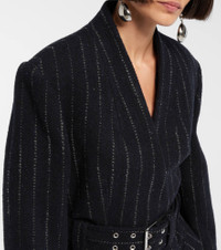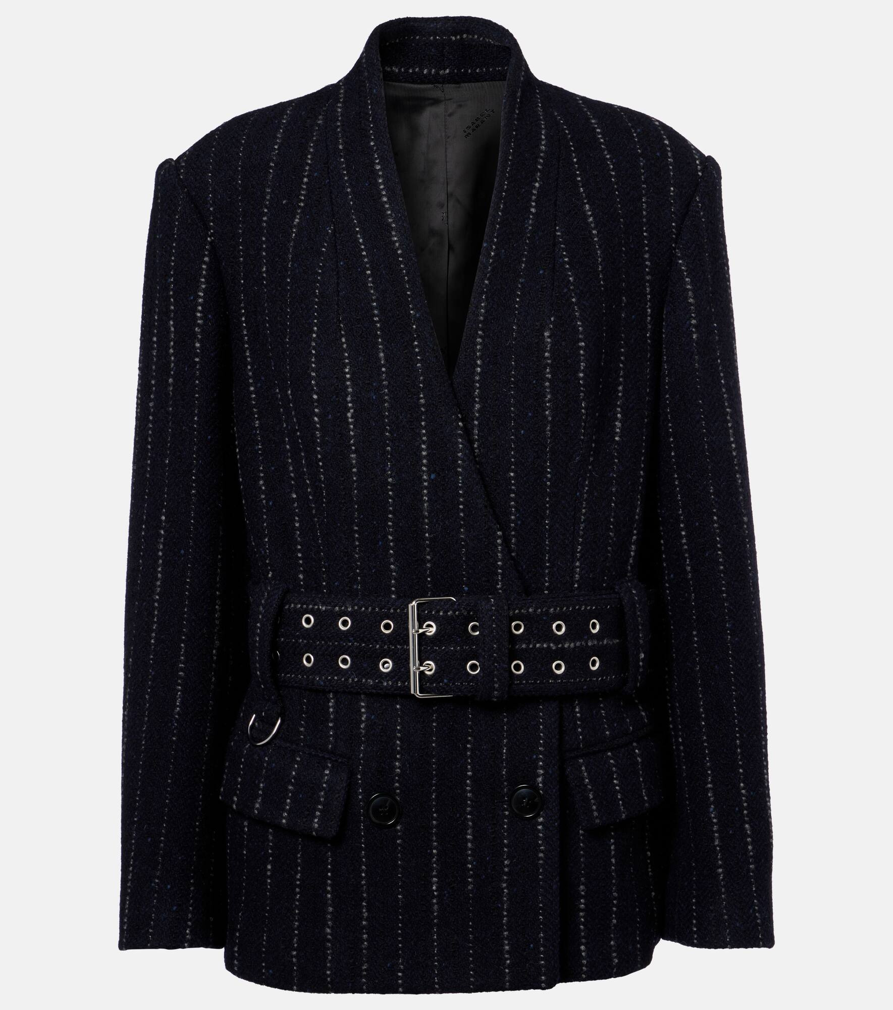 Inspired by Parisian style, each Isabel Marant piece blends refined design with effortless looks for daily life. The Fyma blazer showcases this signature flair with a structured virgin wool construction, elevated by chalk stripe detailing and a detachable belt. Product Details - Material: 100% virgin wool - Care instructions: dry clean - Made in Poland - Designer color name: Midnight - Item color: blue - Hardware color: black, silver - Lining: 100% viscose - Pocket lining: 100% cotton - Collarless - Pockets: flap pockets, internal pocket - Cuff: three buttons - Closure: double-breasted (four buttons) - Attached belt - Vent: single - Item number: P01095382 Size & Fit - True to size - Shoulder pad inserts - Loose fit, comes with belt - Non-stretchy fabric - Falls below the hip - The model seen in the picture is 178cm-5'10" and wearing a size FR 36