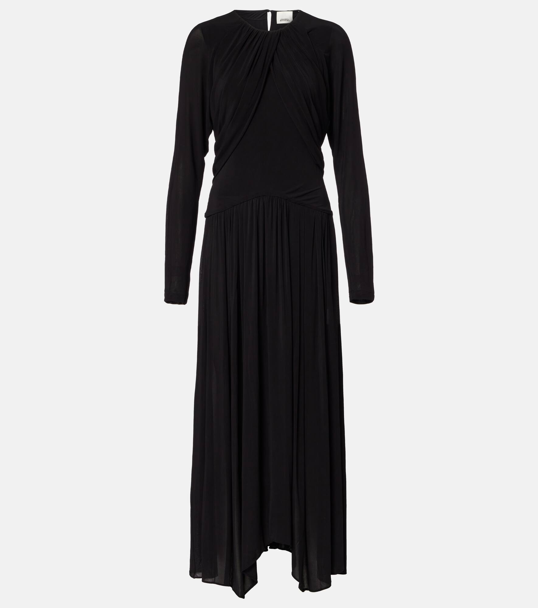The Galina maxi dress from Isabel Marant promises effortless sophistication for all occasions. Made from fluid jersey, this design features an asymmetric hemline, draped overlays on the top, and gathered detailing on the skirt for an elegant finish. Product Details - Material: 92% viscose, 8% elastane - Care instructions: hand wash - Made in Poland - Designer color name: Black - Item color: black - Lining: 100% silk - Closure: zipped side, buttoned back - Item number: P01074411 Size & Fit - True to size - Cinched waist - Non-stretchy fabric - The model seen in the picture is 178cm-5'10" and wearing a size FR 36
