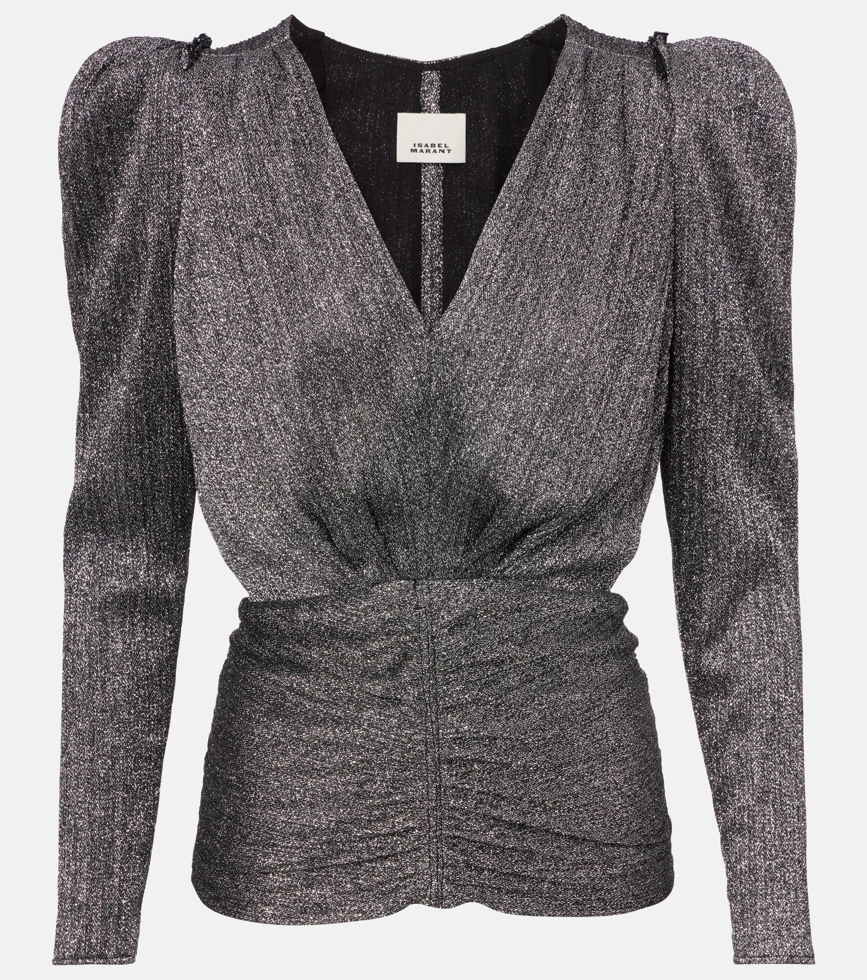 Isabel Marant captures the essence of Parisian chic with designs that blend relaxed elegance with a subtly rebellious spirit. The Marlin long-sleeve top features a glimmering embellishment, a flattering V-neckline, and a zip closure. Product Details - Material: 75% polyester, 25% metallic fibres - Care instructions: dry clean - Made in Bulgaria - Designer color name: Silver - Item color: silver - Details: 100% silk - Lining: 100% silk - Closure: invisible zipper - Item number: P01108408 Size & Fit - True to size - Oversized shoulders - Shoulder pad inserts - Cinched waist - Non-stretchy fabric - Falls to the hip - The model seen in the picture is 178cm-5'10" and wearing a size FR 36