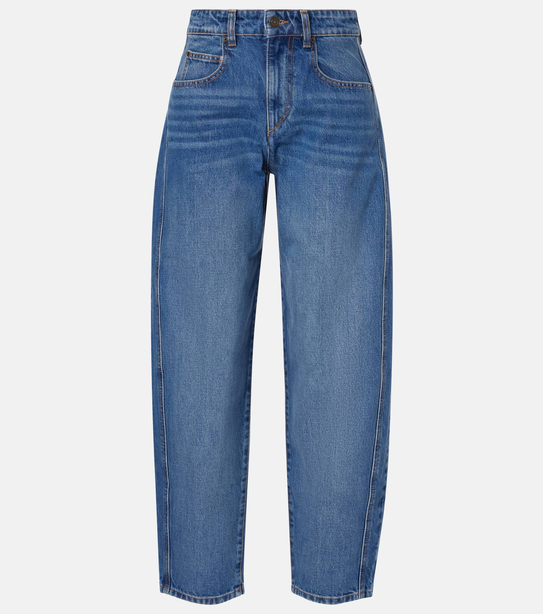 With their sculptural barrel silhouette, Isabel Marant’s Oriane jeans bring a refined twist to off-duty dressing. Featuring a classic five-pocket design, the pair is finished with the label’s signature embossed logo patch at the back. Product Details - Material: 100% cotton - Care instructions: machine wash at 30 degrees - Made in Morocco - Designer color name: Blue - Item color: blue - Hardware color: bronze - Lining: 65% polyester, 35% cotton - Pockets: five pockets - Closure: zip and button fastening - Belt loops - Item number: P01074426 Size & Fit - True to size - Non-stretchy fabric - Tapered leg - Mid-rise - The model seen in the picture is 178cm-5'10" and wearing a size FR 36