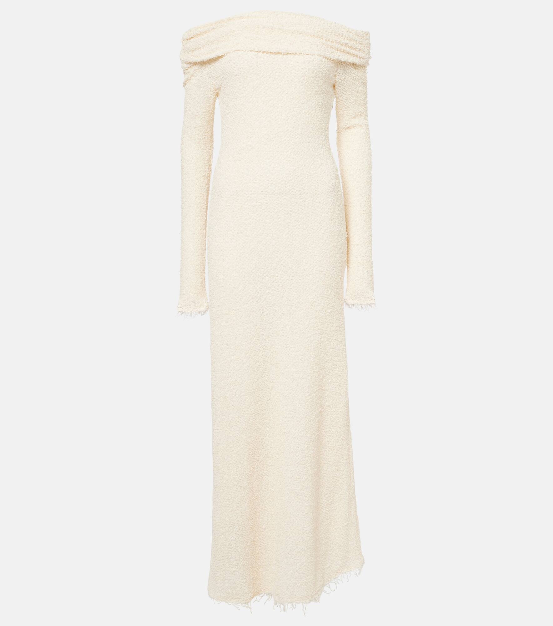Ormany frayed off-the-shoulder bouclé maxi dress Ecru