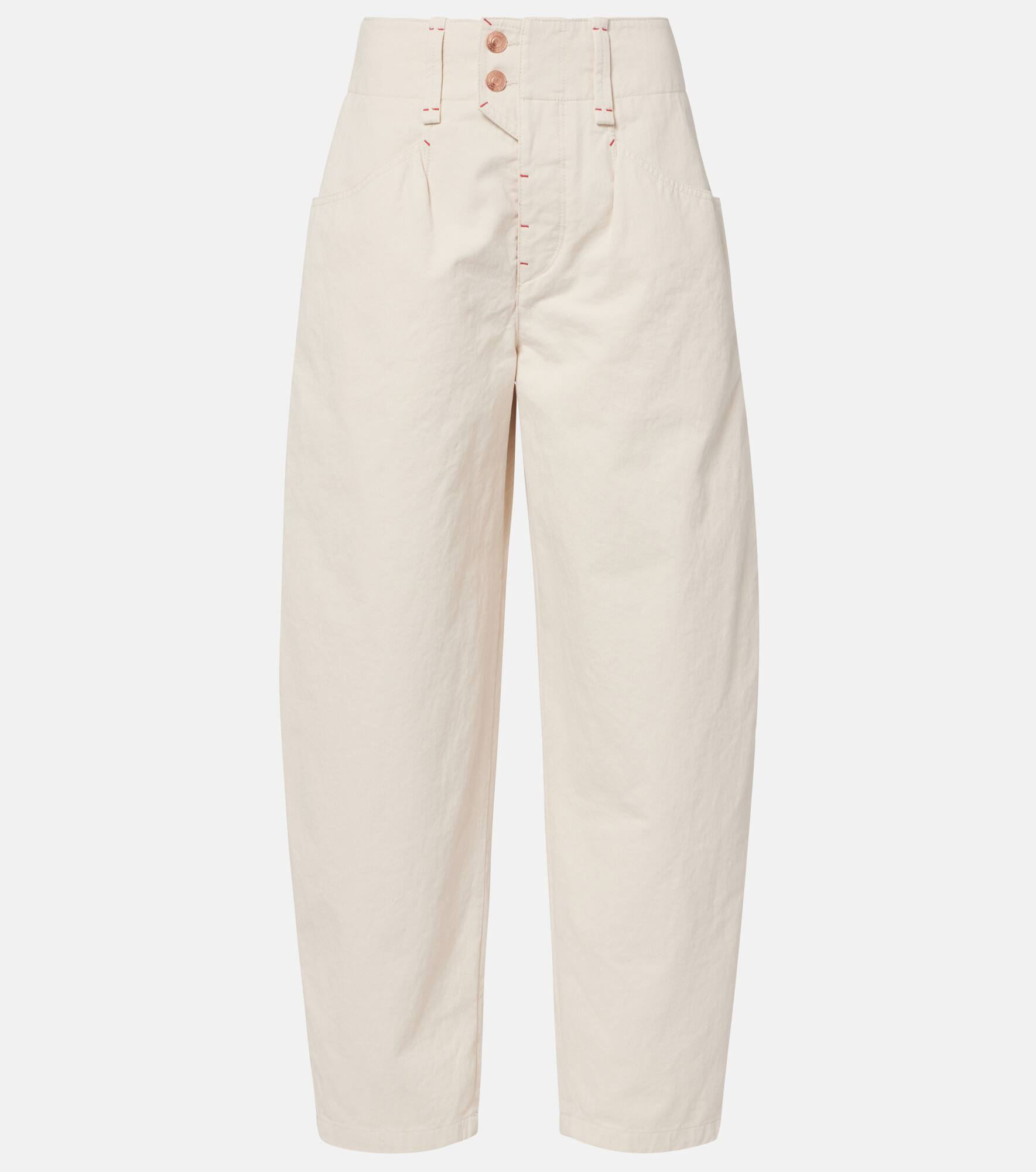 Each Isabel Marant piece is a testament to authentic and effortlessly edgy Parisian style. The Oumaya jeans are made from cotton denim and have a subtle barrel-leg silhouette and a high, buttoned waist. Product Details - Material: 100% cotton - Care instructions: dry clean - Made in Tunisia - Designer color name: Ecru - Item color: beige - Lining: 100% cotton - Hardware color: rose gold - Belt loops - Pockets: slant pockets, back pockets - Closure: concealed button placket - High-rise - Item number: P01074390 Size & Fit - True to size - Non-stretchy fabric - Tapered leg - High-rise - The model seen in the picture is 178cm-5'10" and wearing a size FR 36