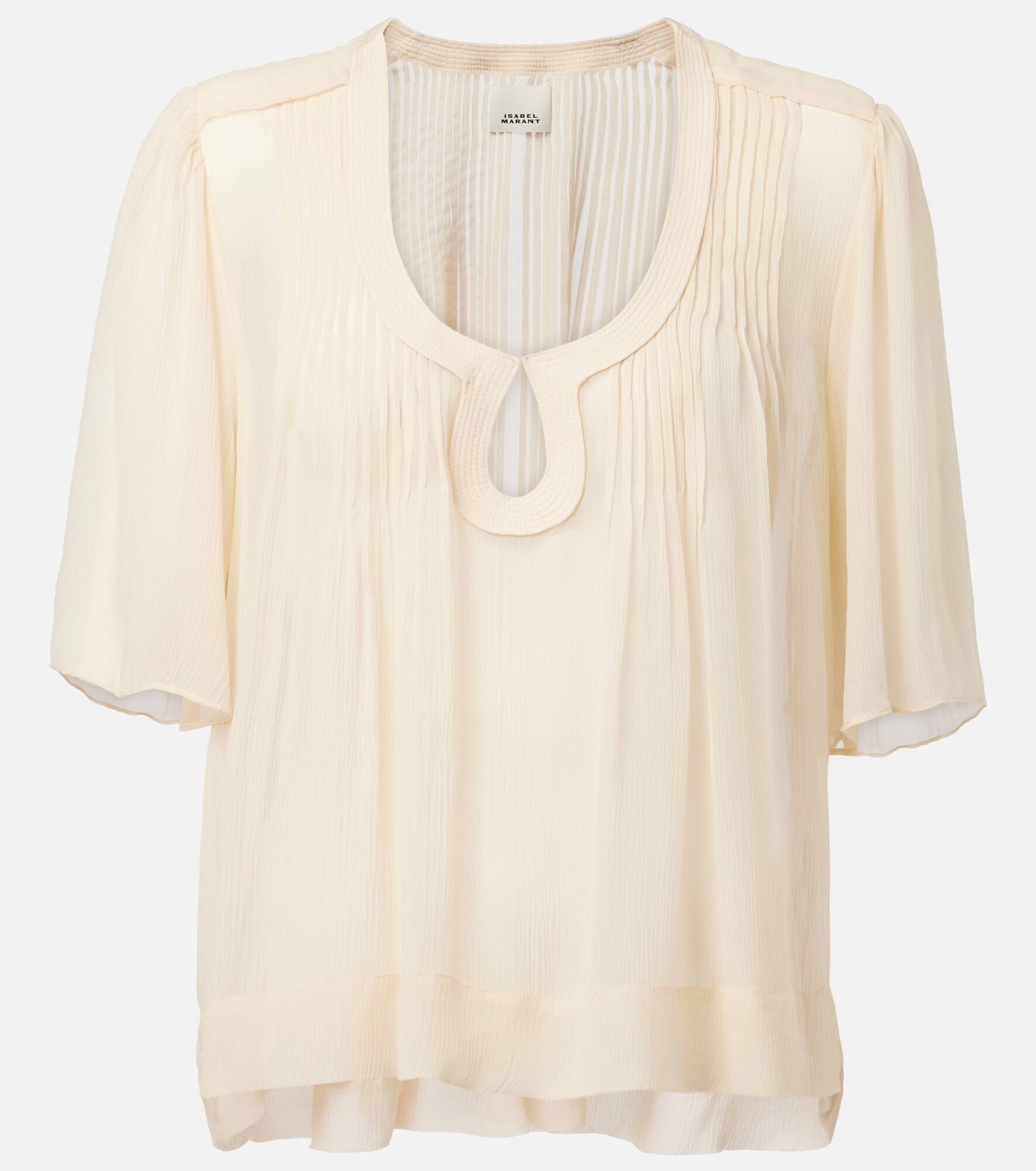 Crafted from pure silk, this sheer top from Isabel Marant features short sleeves and a relaxed silhouette. Designed with a straight hem and round neckline, it falls just below the hip. Product Details - Material: 100% silk - Care instructions: dry clean - Made in India - Designer color name: Ecru - Item color: beige - Lining: 100% silk - Material II: 100% polyester - Item number: P01062212 Size & Fit - True to size - Sheer - Designed for a loose fit - Non-stretchy fabric - Falls to the hip - The model seen in the picture is 178cm-5'10" and wearing a size FR 36