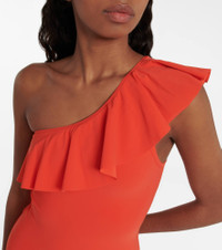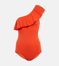 Add a punch of color to your getaway suitcase with the Sicilya swimsuit from Isabel Marant. The orange style is designed with a one-shoulder silhouette, a dramatic ruffled neckline, and a cutout at the back. Product Details - Material: 72% polyamide, 28% elastane - Care instructions: hand wash - Made in Tunisia - Designer color name: Orange - Item number: P00777818 Size & Fit - True to size - Low-cut leg - The model seen in the picture is 178cm-5'10", cup size B, and wearing a size FR 36 - Unpadded Top