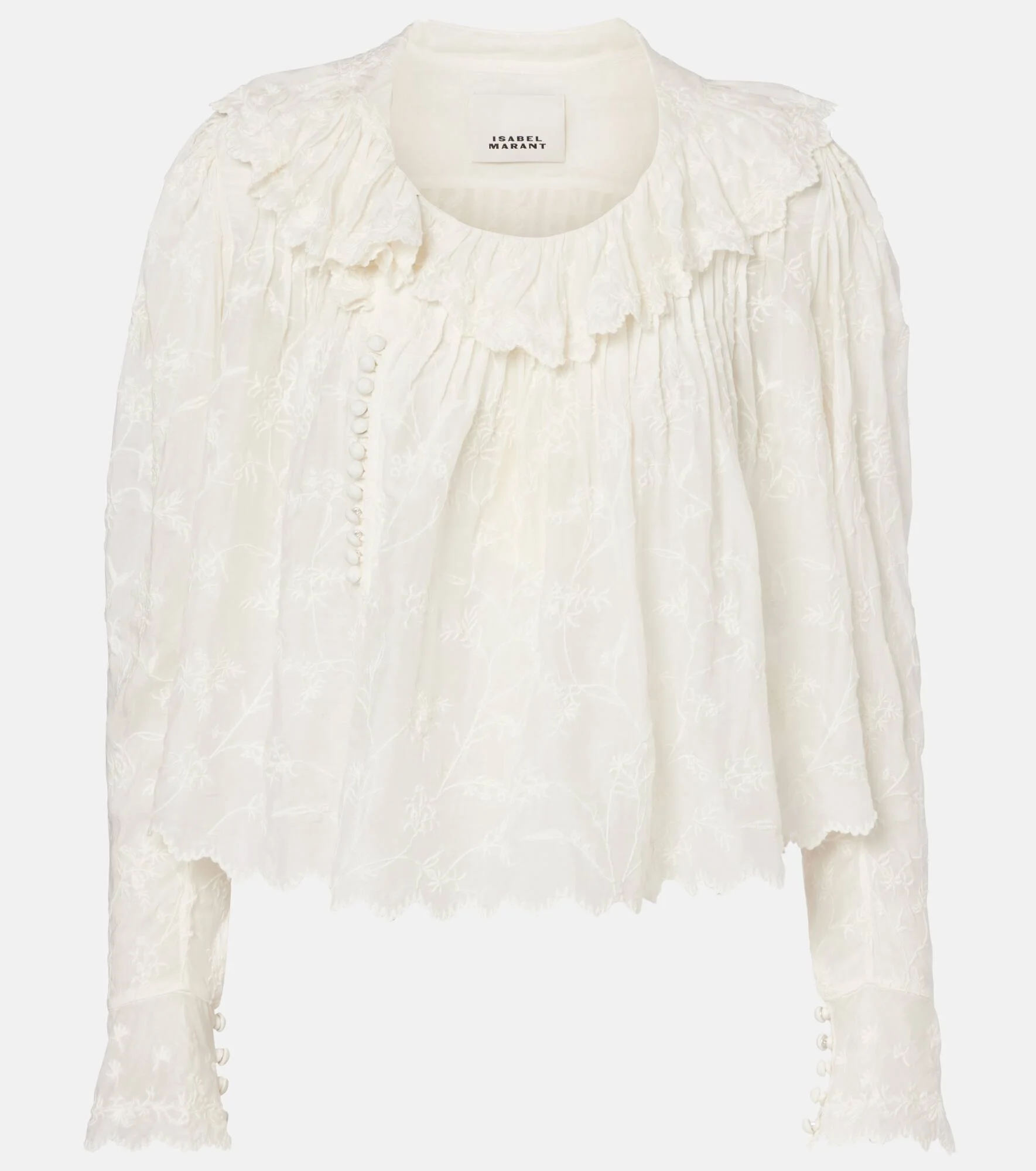 Crafted from delicate cotton and silk, the Zelly blouse from Isabel Marant features a relaxed, flared silhouette adorned with floral embroidery throughout. The design is finished with a flounced neckline, subtle side buttons and softly puffed sleeves, adding an elegant touch to the style. Product Details - Material: 73% cotton, 27% silk - Care instructions: dry clean - Made in India - Color: white - Designer color name: White - Embroidery: 100% polyester - Closure: partially buttoned front - Cuff: buttoned - Item number: P01133896 Size & Fit - True to size - Semi-sheer - Designed for a loose fit - Non-stretchy fabric - Slightly cropped - The model seen in the picture is 178cm-5'10" and wearing a size FR 36