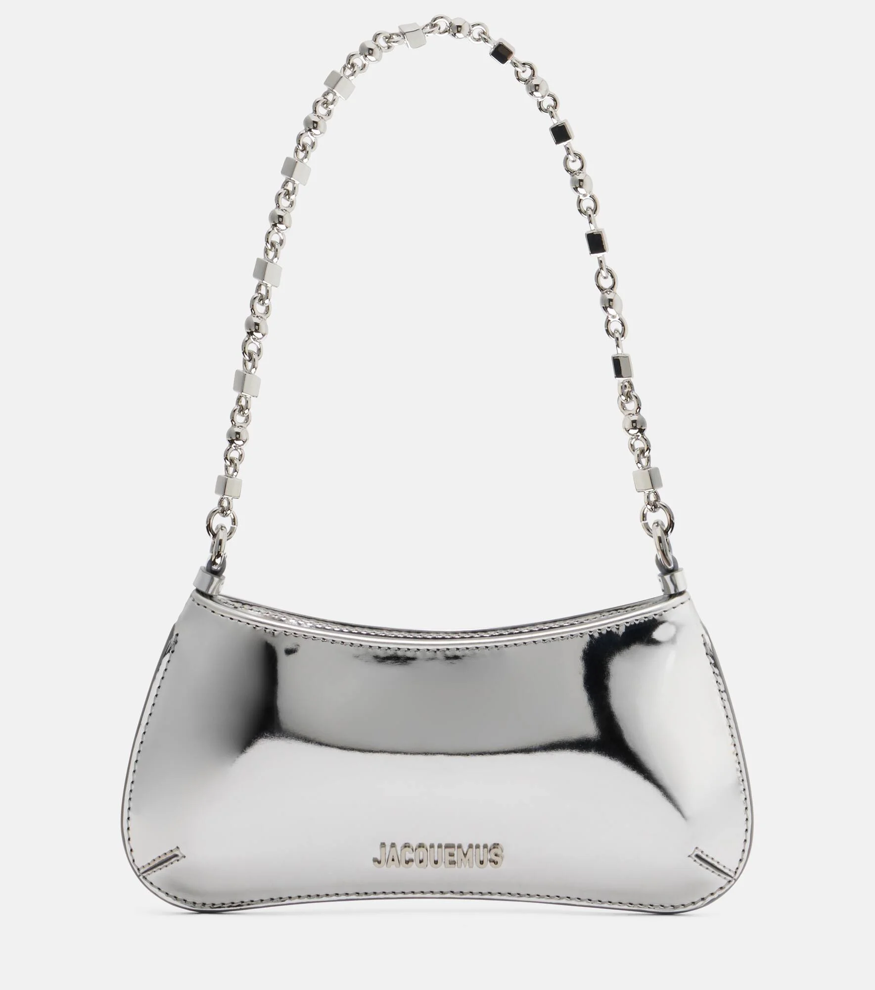 Jacquemus brings a characterful vision of French fashion to the design of every new collection. The Bisou Small shoulder bag is made from mirrored material and features a chain strap. Product Details - Material: synthetic material - Lining: cotton - Made in Italy - Color: silver - Designer color name: Silver - Closure: zipped top - Top handle - Internal details: card slot - Includes: dust bag - Item number: P01139892 Size & Fit - Height 10,5cm-4" - Min. width 18cm-7" - Max. width 24,5cm-9.5" - Depth 2cm-1" - Chain length 44cm-17.5"