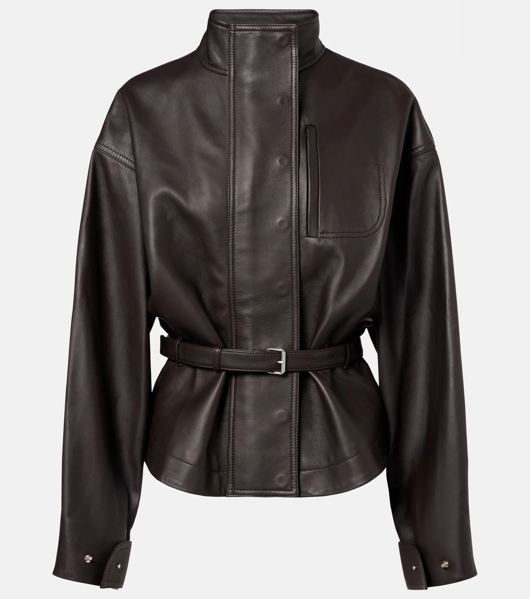 Crafted from supple leather, the Ciro jacket from Jacquemus is shaped in a relaxed silhouette with a stand collar and a belted waist. Subtle side welt pockets and a box pleat at the back complete the sophisticated design. Product Details - Material: 100% lamb leather - Care instructions: specialist clean - Made in Italy - Color: brown - Designer color name: Dark Brown - Lining: 100% cotton - Lining II: 52% viscose, 48% cotton - Closure: zipper, snap-button fastenings - Pockets: welt pockets - Detachable belt - Item number: P01126292 Size & Fit - True to size - Dropped shoulders - Loose fit, comes with belt - Non-stretchy fabric - Falls to the hip - The model seen in the picture is 178cm-5'10" and wearing a size FR 36