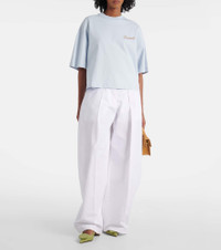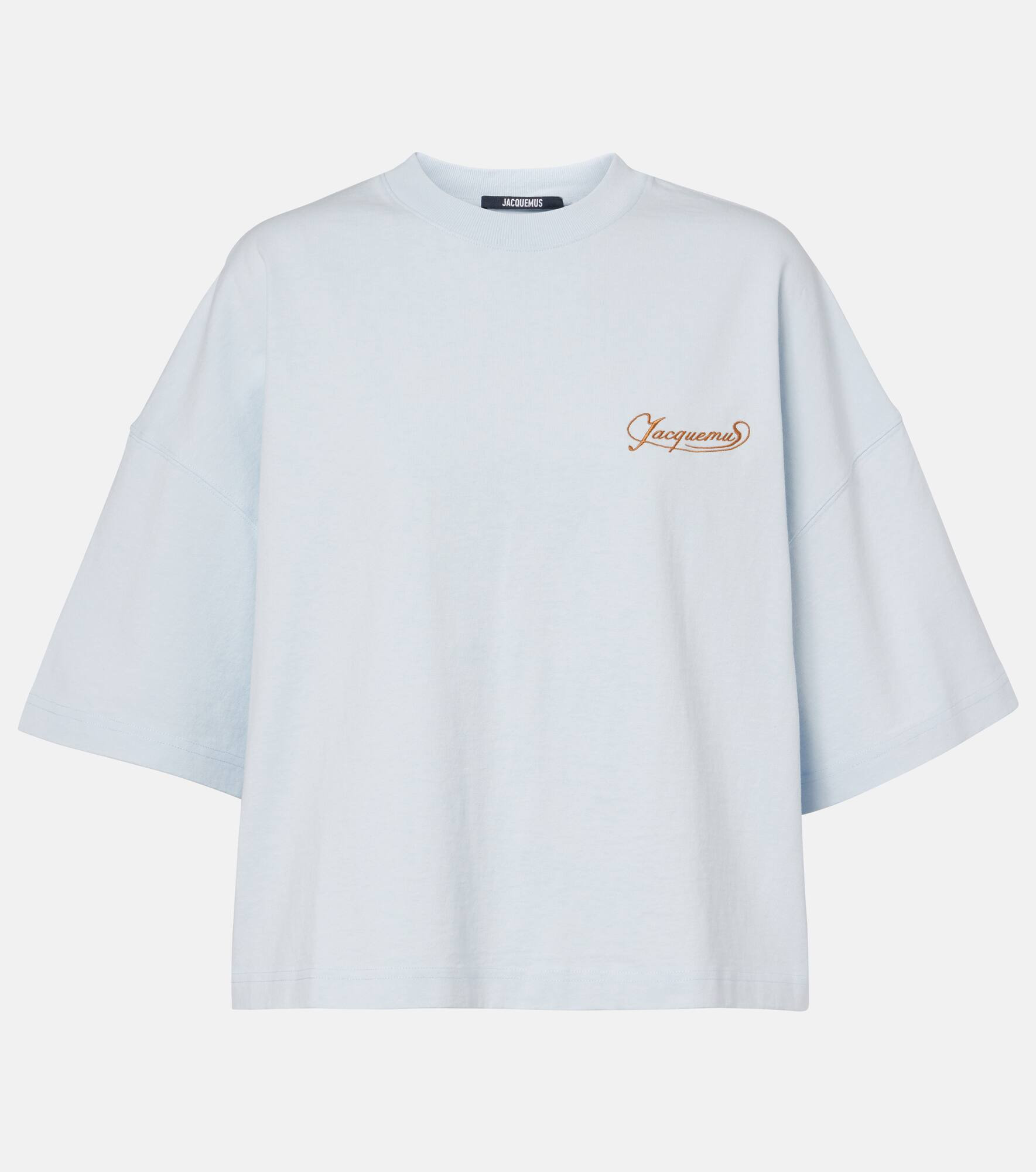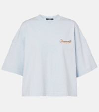 True to its name, the Corto T-shirt from Jacquemus features a cropped, boxy silhouette. This style comes in a pastel blue iteration made from pure cotton and adorned with a 50s-inspired logo embroidery at the chest. Product Details - Material: 100% cotton - Care instructions: machine wash at 30 degrees - Made in Portugal - Designer color name: Uni Club Blue - Item color: blue - Collar: crewneck - Item number: P01077379 Size & Fit - True to size - Dropped shoulders - Oversized - Slightly stretchy fabric - Falls to the hip - The model seen in the picture is 178cm-5'10" and wearing a size XS