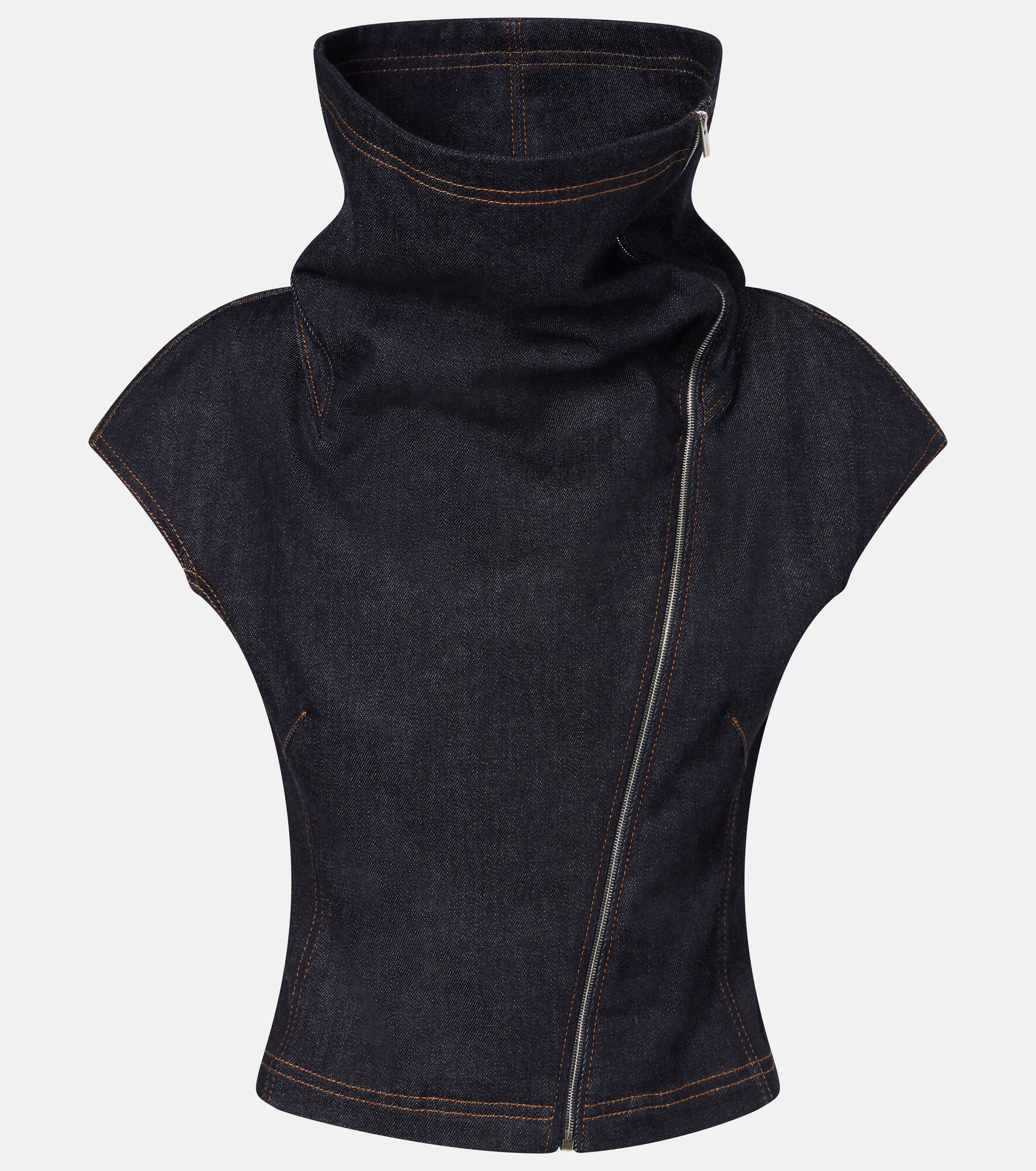 Jacquemus brings a characterful vision of French fashion to the design of every new collection. Crafted from denim, this sculptural top features a high neckline, cap sleeves, and asymmetric zipper closure at the front. Product Details - Material: 93% cotton, 6% cashmere, 1% elastane - Care instructions: dry clean - Made in Romania - Designer color name: Dark Navy - Item color: blue - Closure: zipped front - Dye: dark - Item number: P01077195 Size & Fit - True to size - Cinched waist - Slightly stretchy fabric - Cropped - The model seen in the picture is 178cm-5'10" and wearing a size FR 34
