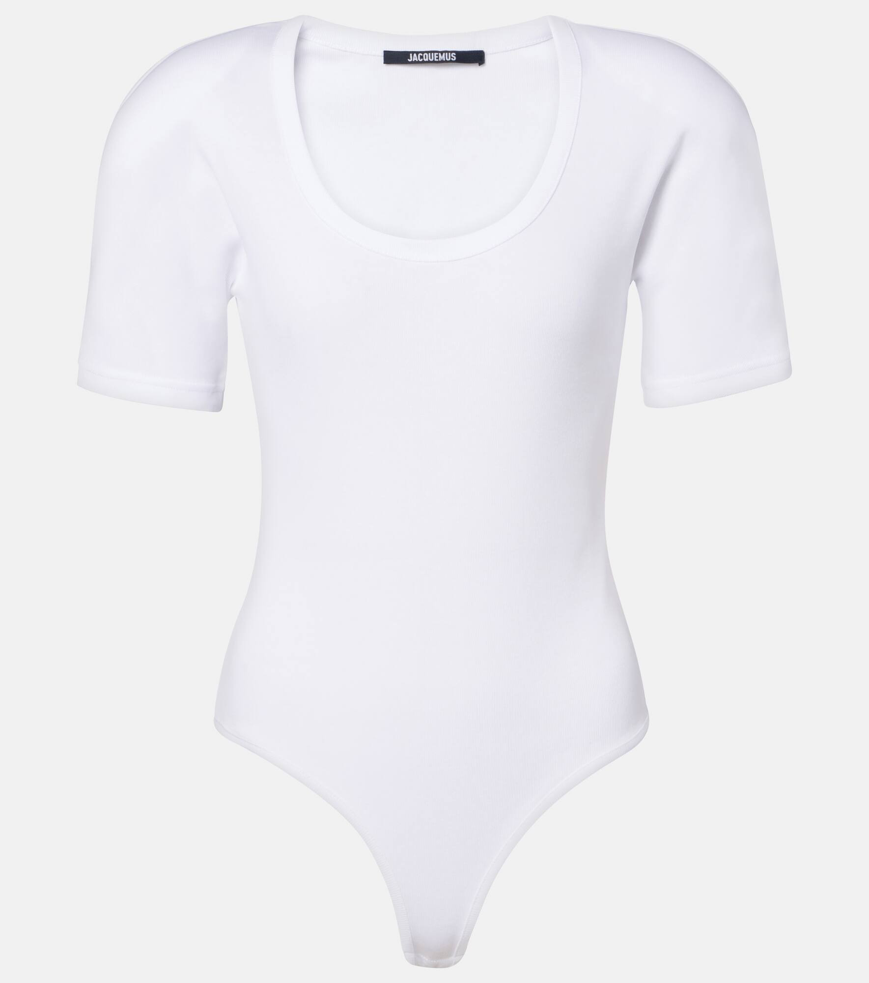 Jacquemus brings a characterful vision of French fashion to the design of every new collection. This fitted top is crafted from cotton and features short sleeves, shoulder pads, and a logo embroidery at the waist. Product Details - Material: 100% cotton - Care instructions: machine wash at 30 degrees - Made in Portugal - Designer color name: White - Item color: white - Shoulder pads - Item number: P01077376 Size & Fit - Fits small to size - we recommend trying one size larger - Shoulder pad inserts - Fitted - Slightly stretchy fabric - Medium-cut leg - The model seen in the picture is 178cm-5'10" and wearing a size S
