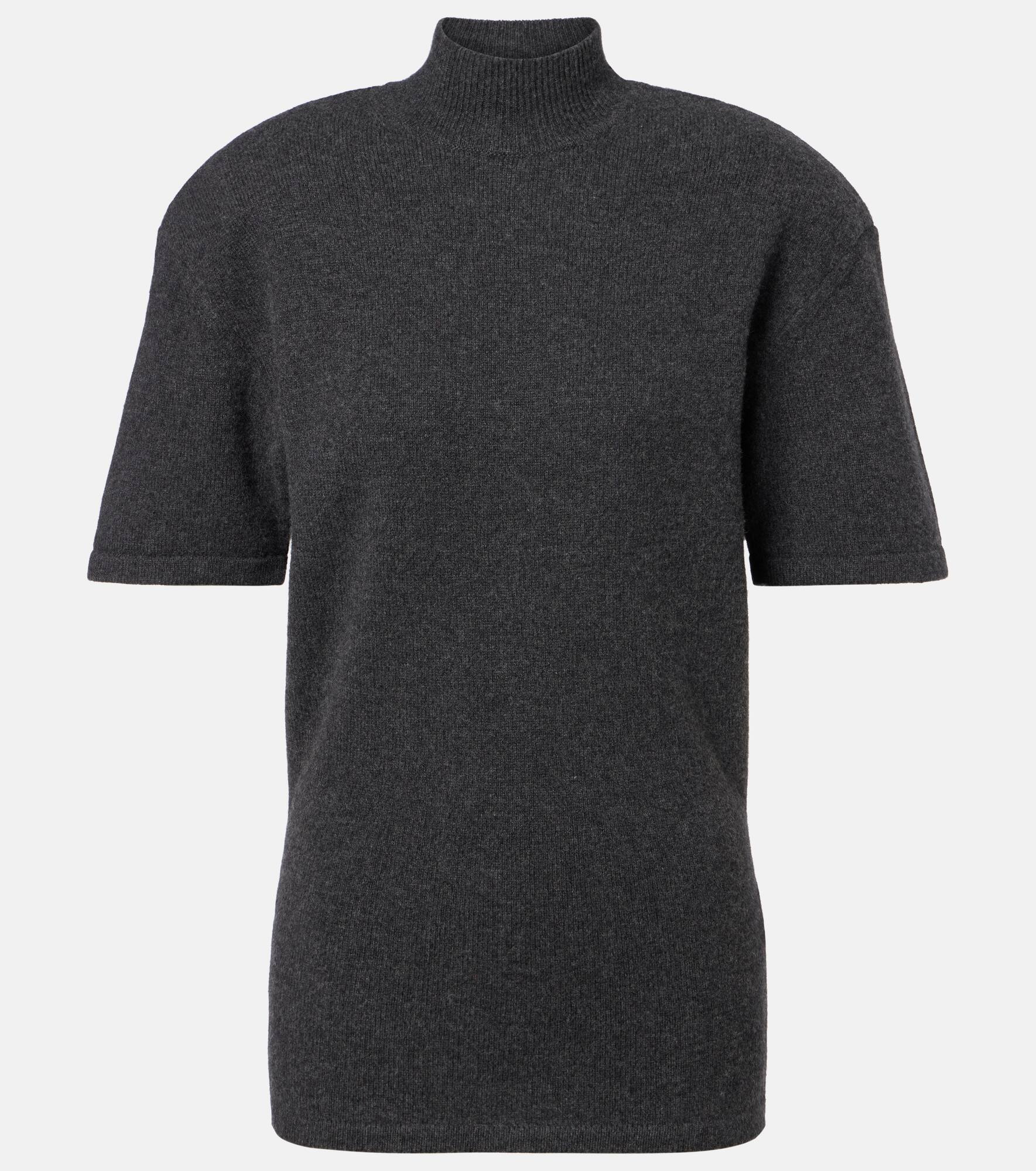 Showcasing understated elegance, this gray sweater from Jacquemus is presented in a short-sleeved silhouette. Made from a wool and cashmere blend, the design features a refined chestnut knit construction. Product Details - Material: 90% wool (merino wool), 10% cashmere - Care instructions: hand wash - Made in Portugal - Designer color name: Dark Grey - Item color: gray - Collar: mockneck - Shoulder pads - Hem: ribbed - Item number: P01077371 Size & Fit - True to size - Shoulder pad inserts - Dropped shoulders - Straight fit - Slightly stretchy fabric - Falls below the hip - The model seen in the picture is 178cm-5'10" and wearing a size FR 34