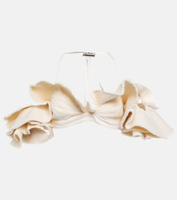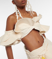 Crafted from pure cotton, this Jacquemus crop top features a voluminous, ruffled silhouette with an off-the-shoulder neckline and thin straps for extra support. Product Details - Material: 100% cotton - Care instructions: dry clean - Made in Portugal - Designer color name: Off White - Item number: P00769094 Size & Fit - True to size - Close fit sleeves - Low back - Fitted - Mid-weight material - Cropped - The model seen in the picture is 178cm-5'10" and wearing a size FR 36