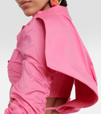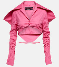 La Chemise Meio shirt from Jacquemus has a unique silhouette that comes in pink cotton poplin. The cropped style features a dramatic pointed collar, gathered long sleeves, and a sleek tie at the waist. Product Details - Made in Bulgaria - Material: 98% cotton, 2% elastane - Closure: buttoned front - Designer color name: Pink - Care instructions: hand wash - Item number: P00769075 Size & Fit - True to size - Fitted - Mid-weight material - Cropped - The model seen in the picture is 178cm-5'10" and wearing a size FR 36