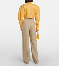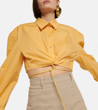 Play with proportions with the La Chemise Plidao shirt from Jacquemus. The cropped design is made from stretchy cotton poplin, has extra long square sleeves, and features a drawstring waist detail. Product Details - Made in Bulgaria - Closure: buttoned front - Material: 98% cotton, 2% elastane - Care instructions: hand wash - Item number: P00769079 Size & Fit - True to size - Oversized shoulders - Dropped shoulders - Cinched waist - Lightweight material - Cropped - The model seen in the picture is 178cm-5'10" and wearing a size FR 36