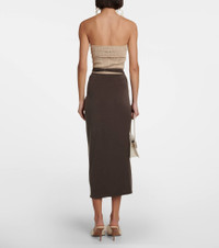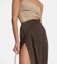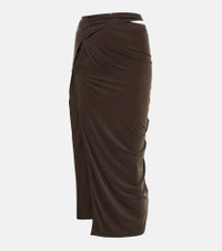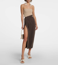 Jacquemus takes classic pieces and twists them into a contemporary new silhouette, spotlighted by the La Jupe Espelho midi skirt. This draped piece has a layered, cutaway waist with a high split. Product Details - Material: 93% cupro, 7% elastane - Care instructions: dry clean - Made in Portugal - Designer color name: Brown - Item number: P00770115 Size & Fit - True to size - Lightweight material - High-waisted - slit length 64cm-25" - The model seen in the picture is 178cm-5'10" and wearing a size XS