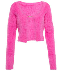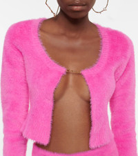 Bring some allure to your everyday edit with La Maille Neve cropped cardigan from Jacquemus. The tactile knit style in pink features a plunging neckline held together by a dainty gold-toned logo charm. Product Details - Material: 98% polyamide, 2% elastane - Care instructions: hand wash - Made in Italy - Designer color name: Pink - Item number: P00718832 Size & Fit - True to size - Straight fit - Mid-weight material - Cropped - The model seen in the picture is 178cm-5'10" and wearing a size FR 36