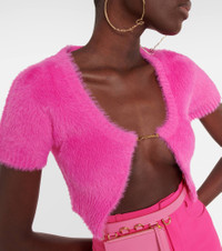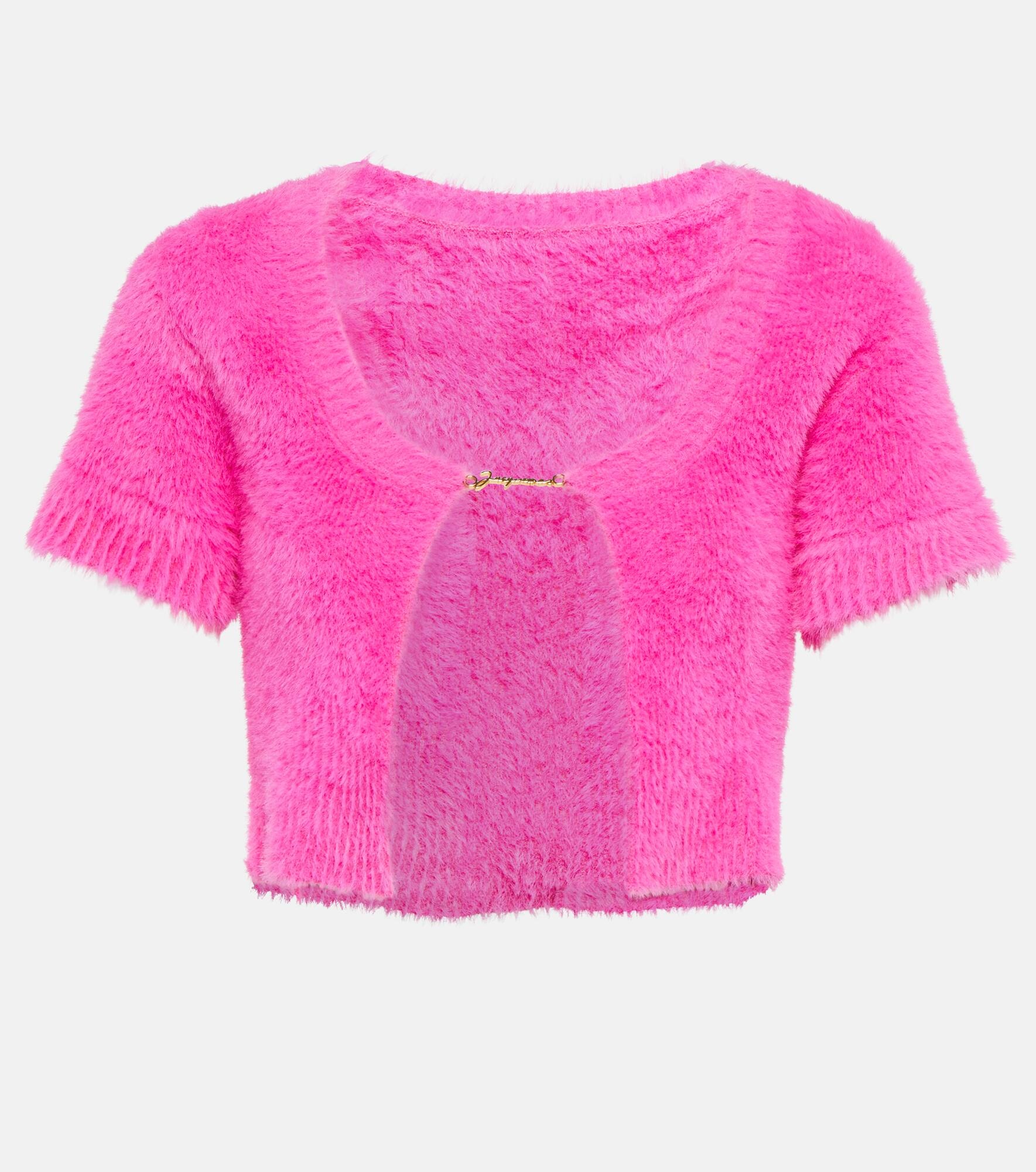 Bring Jacquemus' distinct allure to your wardrobe with the La Maille Neve cardigan in pink. The style is made from a fuzzy knit to an ultra-cropped silhouette and closes with a logo-lettered clasp at the open front. Product Details - Made in Italy - Material: 98% polyamide, 2% elastane - Care instructions: hand wash - Designer color name: Pink - Item number: P00770607 Size & Fit - True to size - Straight fit - Mid-weight material - Cropped - The model seen in the picture is 178cm-5'10" and wearing a size FR 36
