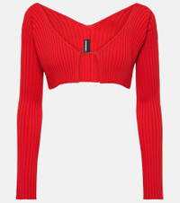 Jacquemus' La Maille Pralù style proves the micro-cardigan trend is here to stay. Shaped into a cropped, skin-revealing silhouette, the ribbed-knit design secures across the chest with a golden nameplate for a glamourous finishing touch. Product Details - Material: 81% viscose, 3% polyester, 12% polyamide, 4% elastane - Care instructions: hand wash - Made in Italy - Designer color name: Red - Item number: P00846366 Size & Fit - True to size - Straight fit - Mid-weight material - Cropped - The model seen in the picture is 178cm-5'10" and wearing a size FR 36