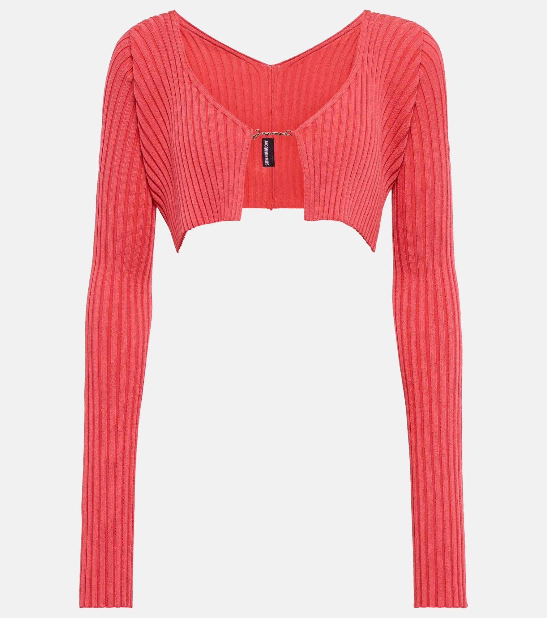 Jacquemus’ penchant for vibrant color is spotlighted by the characterful composition of the La Maille Pralu knit. Cut for a cropped fit, this close-fitting cardigan has a ribbed-knit texture and Simon’s signature in gold-tone hardware. Product Details - Material: 81% viscose, 3% polyester, 12% polyamide, 4% elastane - Care instructions: hand wash - Made in Portugal - Designer color name: Pink - Item number: P00770522 Size & Fit - True to size - Straight fit - Mid-weight material - Cropped - The model seen in the picture is 178cm-5'10" and wearing a size FR 36