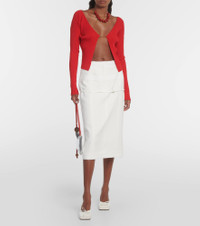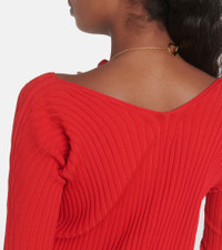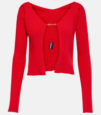 Jacquemus brings a characterful vision of French fashion to the design of every new collection. Presented in a alluring red shade, this La Maille Pralu Longue cardigan features a ribbed-knit finish, linking centrally with gold tone logo detailing. Product Details - Material: 82% viscose, 11% polyamide, 4% elastane, 3% polyester - Care instructions: dry clean - Made in Italy - Designer color name: Red - Item number: P00846371 Size & Fit - True to size - Designed for a loose fit - Mid-weight material - Falls to the hip - The model seen in the picture is 178cm-5'10" and wearing a size FR 36