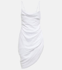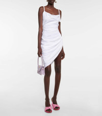 The La Robe Saudade dress is a mini-length take on a standout style from Jacquemus' L'Annee 1997 runway show. This figure-skimming style in white voile has a draped neckline, strappy open back and one-sided ruching. Product Details - Closure: zipped side - Adjustable shoulder straps - Care instructions: dry clean - Designer color name: White - Lining: 3% elastane, 97% cotton - Material: 12% polyamide, 88% viscose - Made in Romania - Item number: P00719175 Size & Fit - Fits large to size - we recommend trying one size smaller - Low back - Cinched waist - Mid-weight material - The model seen in the picture is 178cm-5'10" and wearing a size FR 34