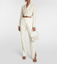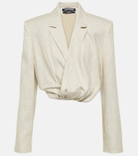 Jacquemus brings a characterful vision of French fashion to the design of every new collection. The La Veste Bahia Courte blazer has traditionally tailored elements, interrupted by a gathered cropped hem for an off-kilter finish. Product Details - Made in Bulgaria - Care instructions: dry clean - Material: 30% linen, 70% viscose - Designer color name: Light Beige - Item number: P00845935 Size & Fit - True to size - Oversized shoulders - Shoulder pad inserts - Cinched waist - Mid-weight material - Cropped - The model seen in the picture is 178cm-5'10" and wearing a size FR 36