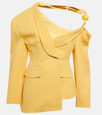 La Veste Baska blazer from Jacquemus is artfully deconstructed with an asymmetrical silhouette and an exposed shoulder. Refreshed for the warmer months in a linen blend, this style features a draped sleeve and bead detail. Product Details - Pocket lining: 35% cotton, 65% polyester - Closure: button fastening - Pockets: flap pockets - Care instructions: dry clean - Made in Romania - Lining: 48% acetate, 46% cotton, fully lined, 6% elastane - Material: 60% linen, 14% polyester, 26% viscose - Designer color name: Yellow - Item number: P00768968 Size & Fit - True to size - Oversized shoulders - Shoulder pad inserts - Cinched waist - Mid-weight material - Falls below the hip - The model seen in the picture is 178cm-5'10" and wearing a size FR 36