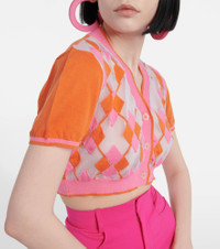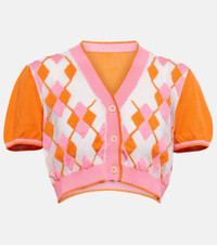 Jacquemus' Le Cardigan Toledo cardigan is intarsia-knitted with a multicolored Argyle-inspired pattern. True to the house's playful spirit, the short-sleeve style is made from a semi-sheer cotton blend and shaped into a contemporary cropped silhouette. Product Details - Material: 70% cotton, 30% polyamide - Made in Italy - Closure: buttoned front - Care instructions: hand wash - Item number: P00770519 Size & Fit - True to size - Semi-sheer - Cinched waist - Mid-weight material - Cropped - The model seen in the picture is 178cm-5'10" and wearing a size FR 36