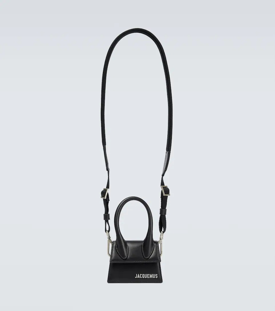 This iconic mini bag from Jacquemus comes in black leather, featuring silver-tone lettering and a detachable technical canvas shoulder strap with leather insert. Product Details - Top handle, Detachable shoulder strap - Closure: magnetic-tab fastening - Designer color name: Black - Internal details: fabric lining - Comes with dust bag - Made in Italy - Color of fastening: silver - Material: calf leather - Item number: P00654432 Size & Fit - Height 9cm-3.5" - Max. width 12cm-4.5" - Max. depth 6cm-2.5" - Min. length shoulder strap 104cm-41" - Max. length shoulder strap 110cm-43.5"