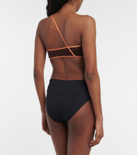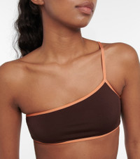 Set apart by its modern aesthetic, this bikini top from Jacquemus is designed with a single shoulder strap and bordered with orange trims. Product Details - Material: 4% polyester, 80% recycled polyester, 16% elastane - Care instructions: hand wash - Made in Portugal - Designer color name: Dark Brown - Item number: P00770665 Size & Fit - True to size - The model seen in the picture is 178cm-5'10", cup size B, and wearing a size XS - Unpadded Top