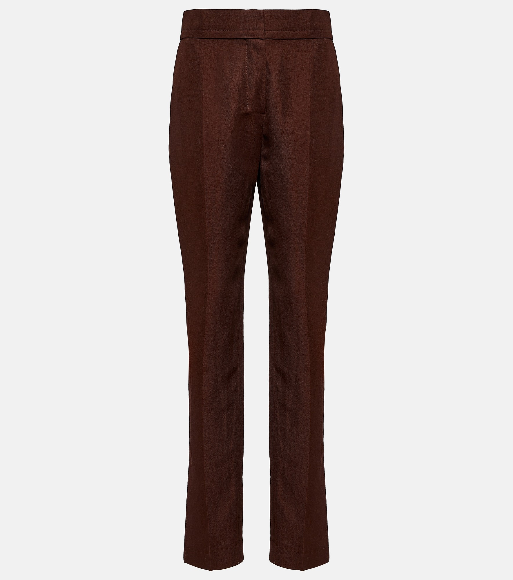 Inspired by the French countryside, Jacquemus designs with organic materials and vibrant colors. The Le Pantalon Tibau pants have a high-rise tapered silhouette, featuring a branded tab on the side and split hems. Product Details - Closure: zipper fly, button and hook fastenings - Made in Bulgaria - Pockets: side slit pockets, back pockets - Designer color name: Dark Brown - Care instructions: dry clean - Material: 36% linen, 64% viscose - Item number: P00768989 Size & Fit - True to size - Mid-weight material - Tapered leg - High-waisted - The model seen in the picture is 178cm-5'10" and wearing a size FR 36