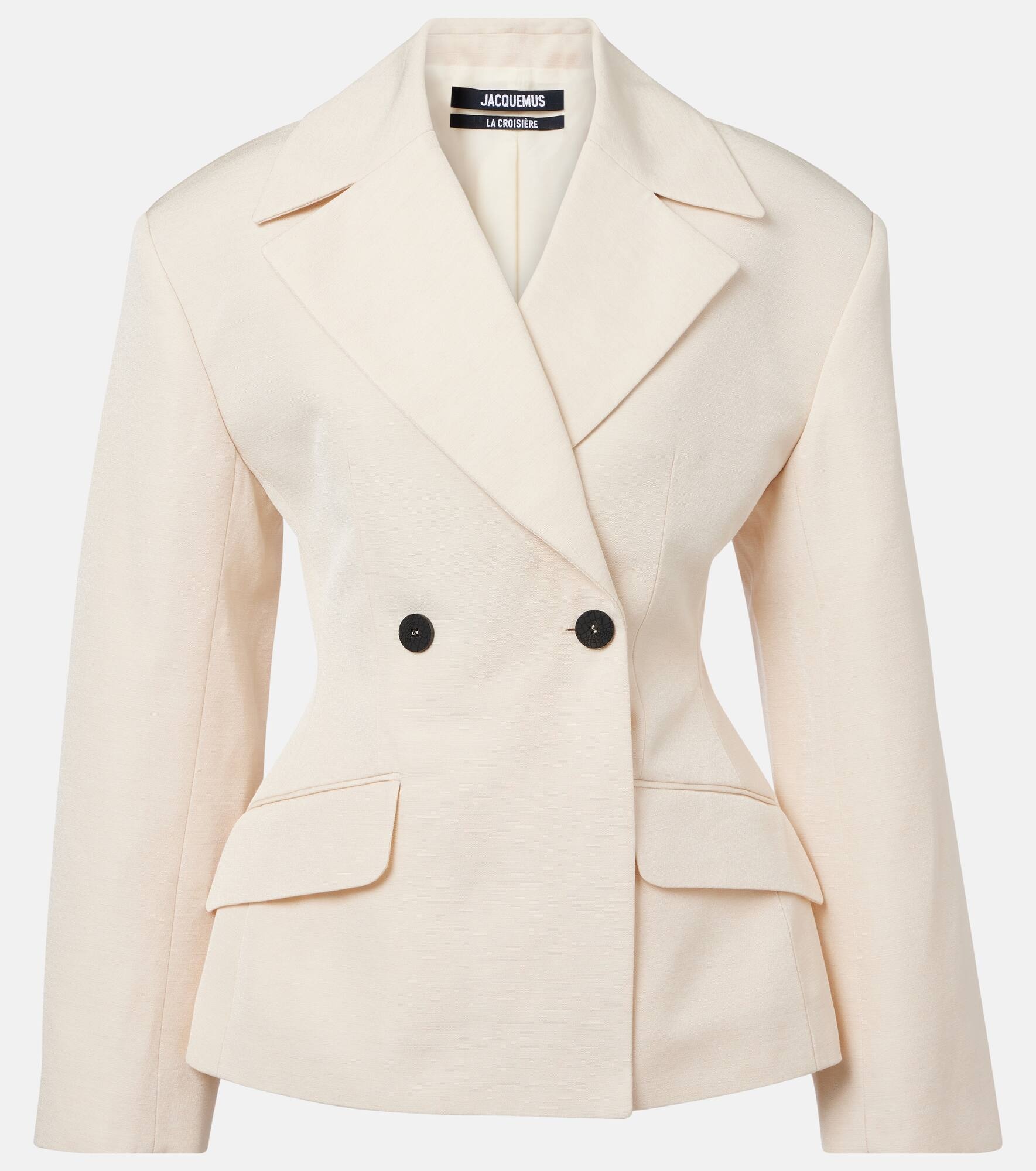 Product Details - Material: 51% viscose, 43% linen, 6% polyamide - Care instructions: dry clean - Made in Romania - Designer color name: Light Beige - Item color: beige - Closure: double-breasted - Pockets: flap pockets - Item number: P01021869 Size & Fit - True to size - Oversized shoulders - Shoulder pad inserts - Cinched waist - Non-stretchy fabric - Falls to the hip - The model seen in the picture is 178cm-5'10" and wearing a size FR 34