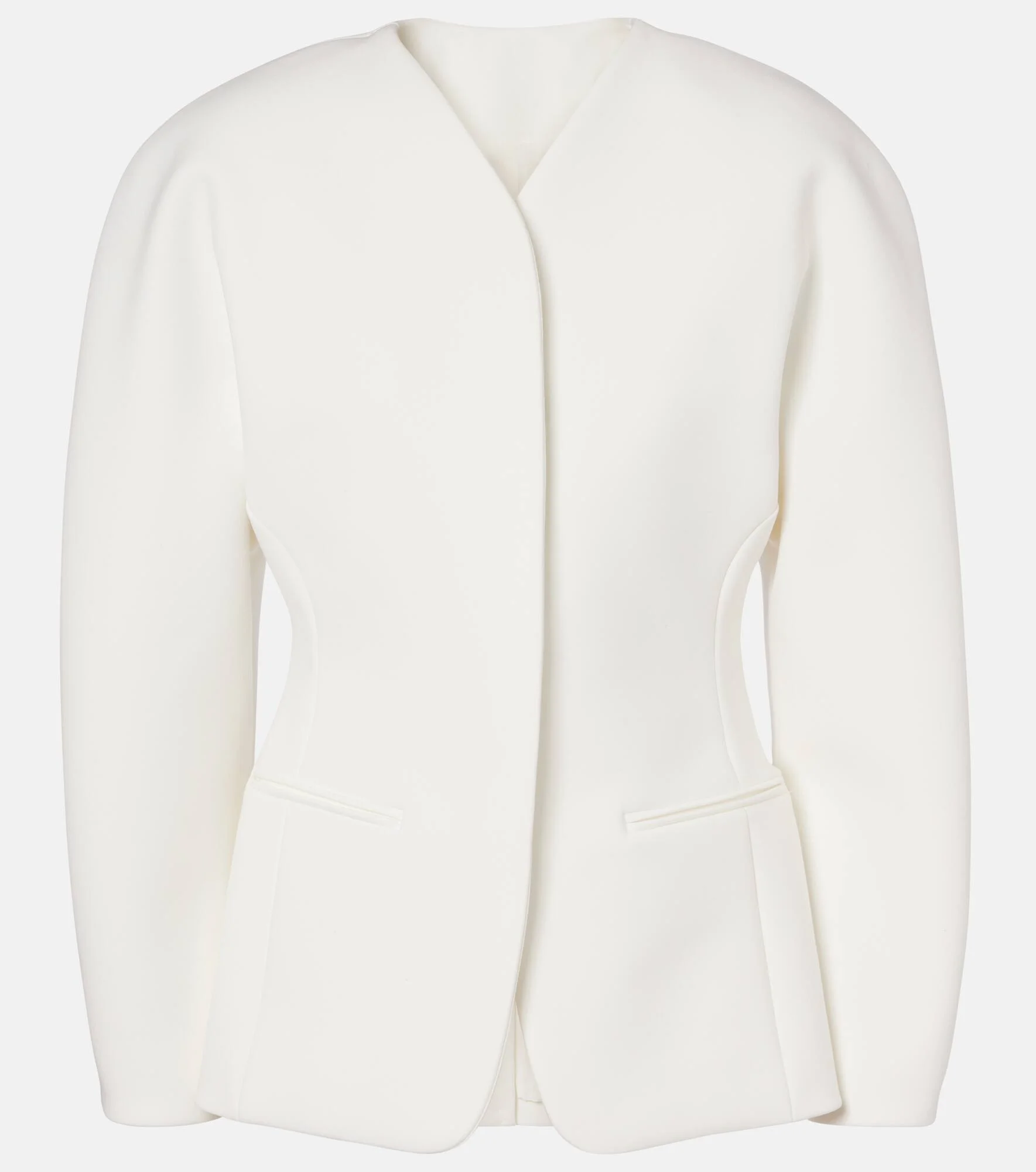 Jacquemus brings a characterful vision of French fashion to the design of every new collection. The Ovalo jacket is crafted from a stiff fabric, and its crescent sleeves and padded shoulders add volume to the fitted silhouette. Product Details - Material: 62% polyester, 33% viscose, 5% elastane - Care instructions: dry clean - Made in Bulgaria - Color: white - Designer color name: White - Material II: 64% polyester, 32% viscose, 4% elastane - Lining: 52% viscose, 48% cotton - Shoulder pads - Closure: concealed buttoned front - Pockets: jetted - Item number: P01126299 Size & Fit - True to size - Oversized shoulders - Shoulder pad inserts - Cinched waist - Non-stretchy fabric - Falls below the hip - The model seen in the picture is 178cm-5'10" and wearing a size FR 34