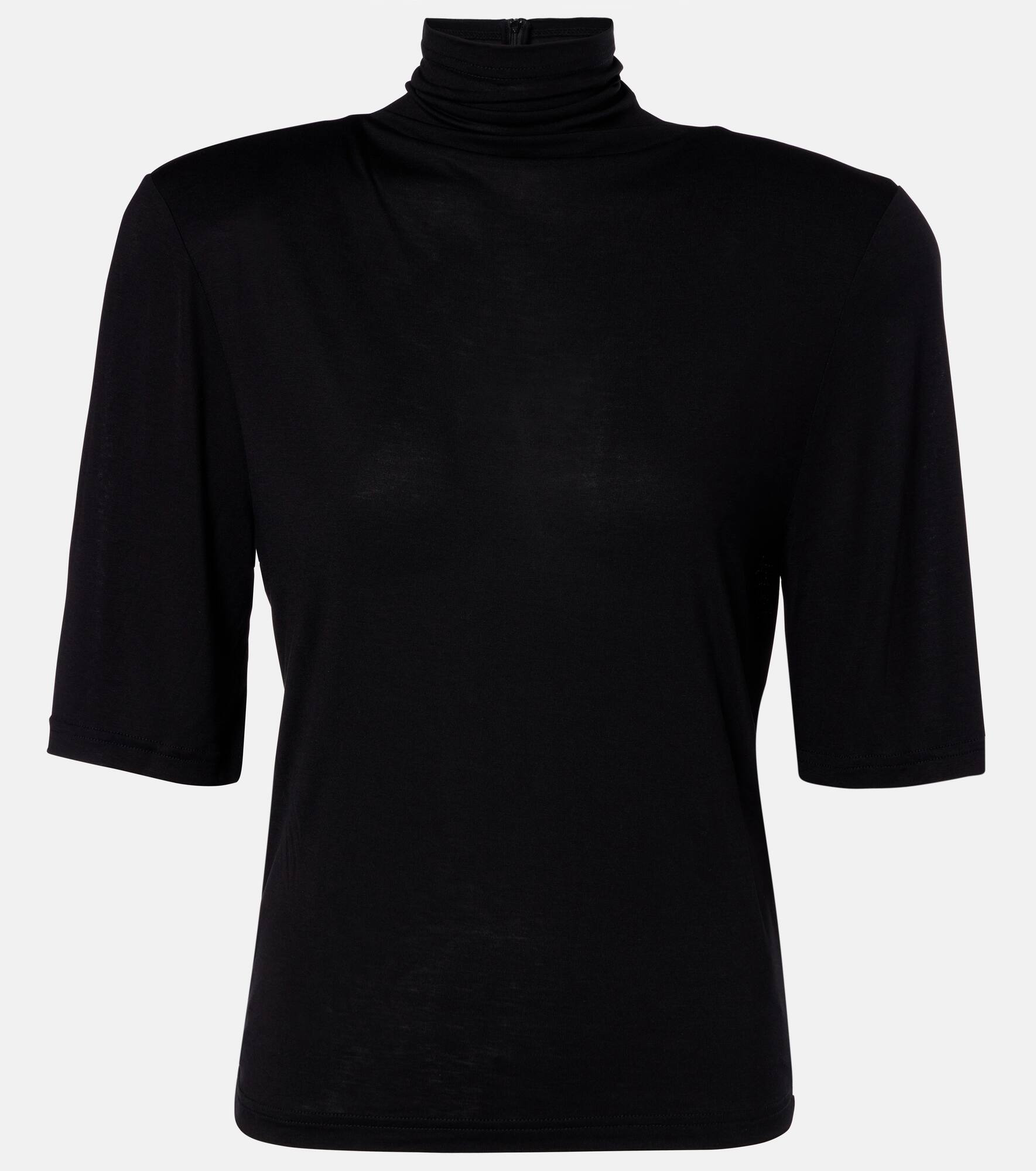 Jacquemus brings a characterful vision of French fashion to the design of every new collection. This turtleneck top features a sleek silhouette with shoulder pads and zipped back closure. Product Details - Material: 88% viscose, 12% silk - Care instructions: hand wash - Made in Portugal - Designer color name: Black - Item color: black - Collar: turtleneck - Closure: zipped back - Shoulder pads - Item number: P01075945 Size & Fit - True to size - Oversized shoulders - Shoulder pad inserts - Cinched waist - Stretchy fabric - Falls to the hip - The model seen in the picture is 178cm-5'10" and wearing a size XS