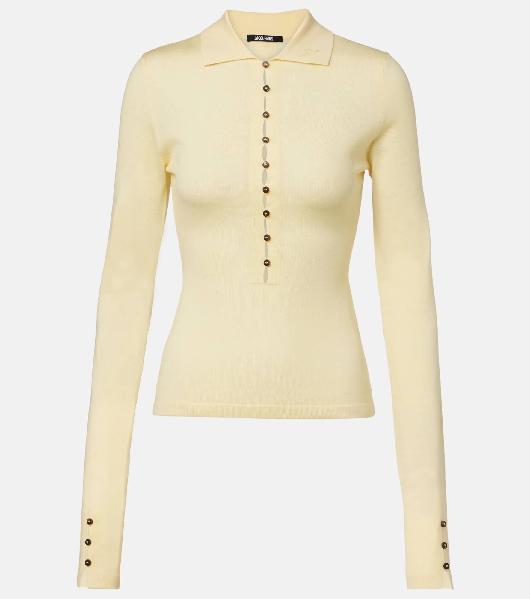 Jacquemus brings a characterful vision of French fashion to the design of every new collection. Crafted from wool, this polo sweater comes in a transparent finish, secured by button fastening on the front and back. Product Details - Material: 98% wool (merino wool), 2% polyamide - Care instructions: hand wash - Made in Romania - Designer color name: Pale Yellow - Item color: yellow - Collar: polo collar - Closure: partially buttoned front - Cuff: buttoned - Item number: P01077356 Size & Fit - True to size - For a looser fit, we recommend taking one size up - Semi-sheer - Fitted - Stretchy fabric - Slightly cropped