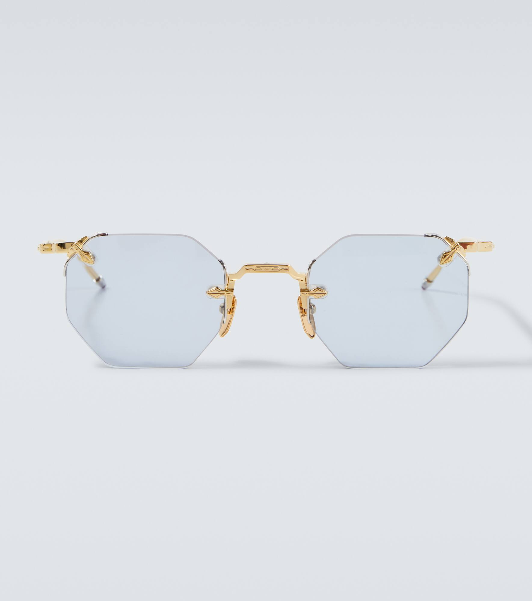 Drawing inspiration from an eclectic mix of art movements, Jacques Marie Mage crafts eyewear that serves as a collectible objet d'art. Inspired by the 1930's spectacles, the El Dorado square sunglasses are defined by octogonal, rimless titanium frames. Product Details - Frame material: titanium - Frame color: gold - Lens filter category 2 - Lens color: blue - Handmade in Japan - Includes: case and presentation box, cleaning cloth - The color of the case may vary - Item number: P01086530 Size & Fit - Lens width: 47mm-1.85" - Bridge size: 25mm-1" - Earpiece length: 140mm-5.5"