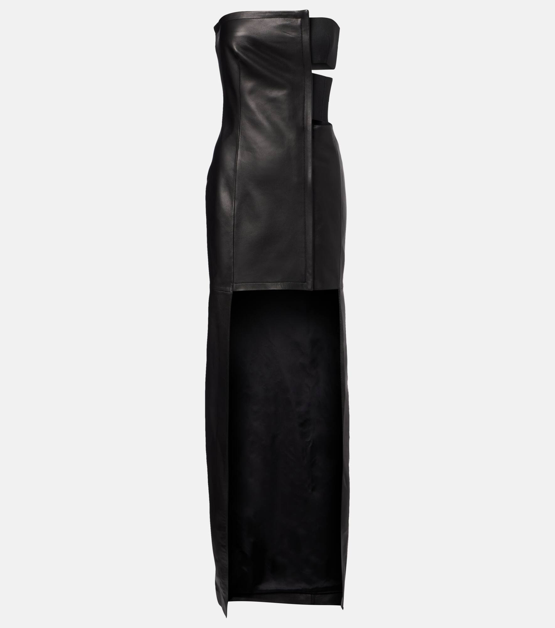 Crafted from leather, this strapless maxi dress by Jean Paul Gaultier features daring front cutouts. Designed with an asymmetric silhouette, this piece reveals a minidress-length front contrasted by an ankle-grazing back. Product Details - Material: 100% lamb leather - Care instructions: specialist clean - Made in Turkey - Designer color name: Black - Item color: black - Lining: 100% viscose - Contains non-textile parts of animal origin - Hardware color: silver - Closure: zipped side - Item number: P01110223 Size & Fit - Fits large to size - we recommend trying one size smaller - Low back - Strapless - Cinched waist - Non-stretchy fabric - The model seen in the picture is 178cm-5'10" and wearing a size FR 34