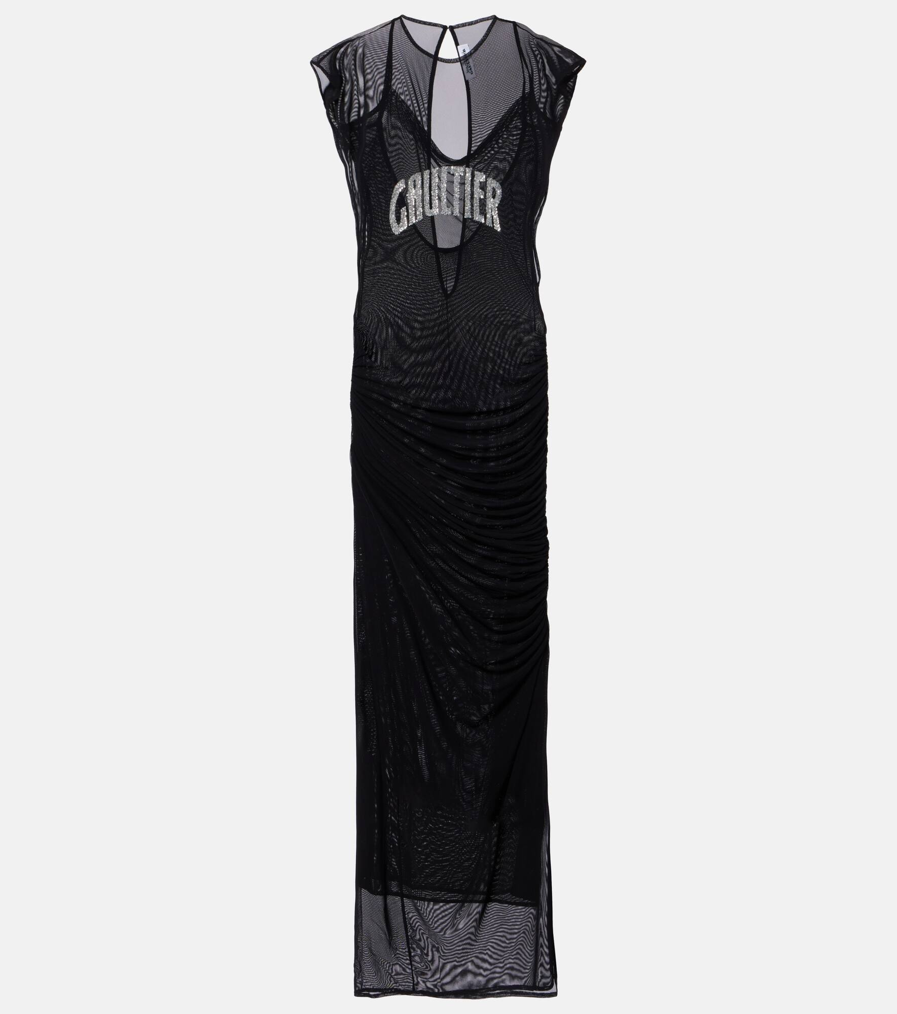 This layered maxi dress by Jean Paul Gaultier is crafted from sheer mesh for a seductive evening look. The two-piece silhouette is finished with a sequined signature detail at the front and a daring cutout accent. Product Details - Material: 94% polyamide, 6% elastane - Care instructions: machine wash at 30 degrees - Made in Portugal - Designer color name: Black/Silver - Item color: black, silver - Two-piece set - Item number: P01110224 Size & Fit - True to size - Low back - Semi-sheer - Fitted - Slightly stretchy fabric - The model seen in the picture is 178cm-5'10" and wearing a size XS