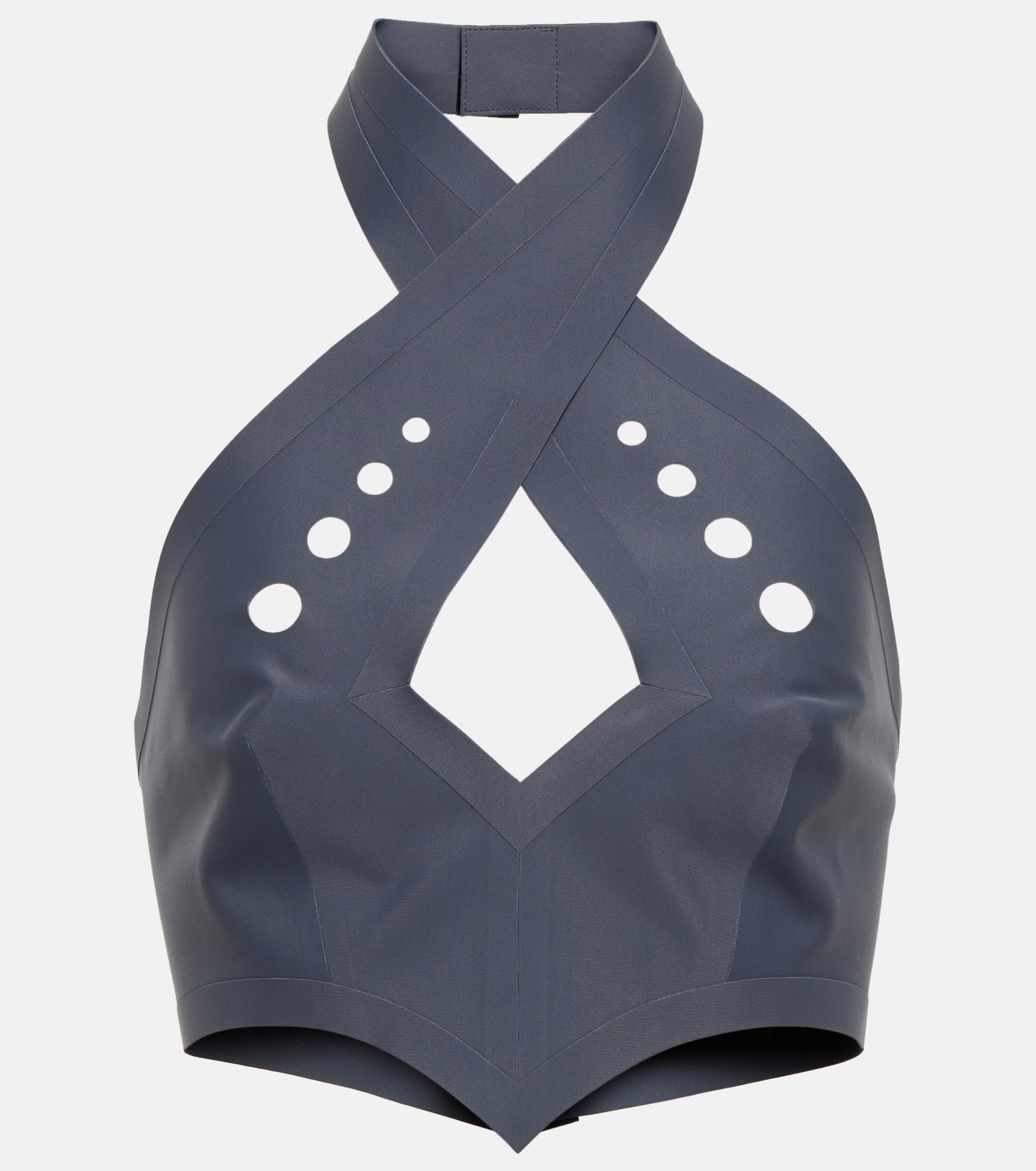 Part of the Cyber Collection, this Jean Paul Gautier crop top is made from stretchy jersey for a figure-sculpting fit with bust cutout-detailing and a shaped hem. It’s defined by gradient perforations at the halter neckline straps. Product Details - Material: 78% polyamide, 22% elastane - Made in Italy - Care instructions: hand wash - Designer color name: Darkgrey - Item number: P00750837 Size & Fit - Fits large to size - we recommend trying one size smaller - Fitted - Lightweight material - Cropped - The model seen in the picture is 178cm-5'10" and wearing a size FR 34
