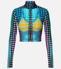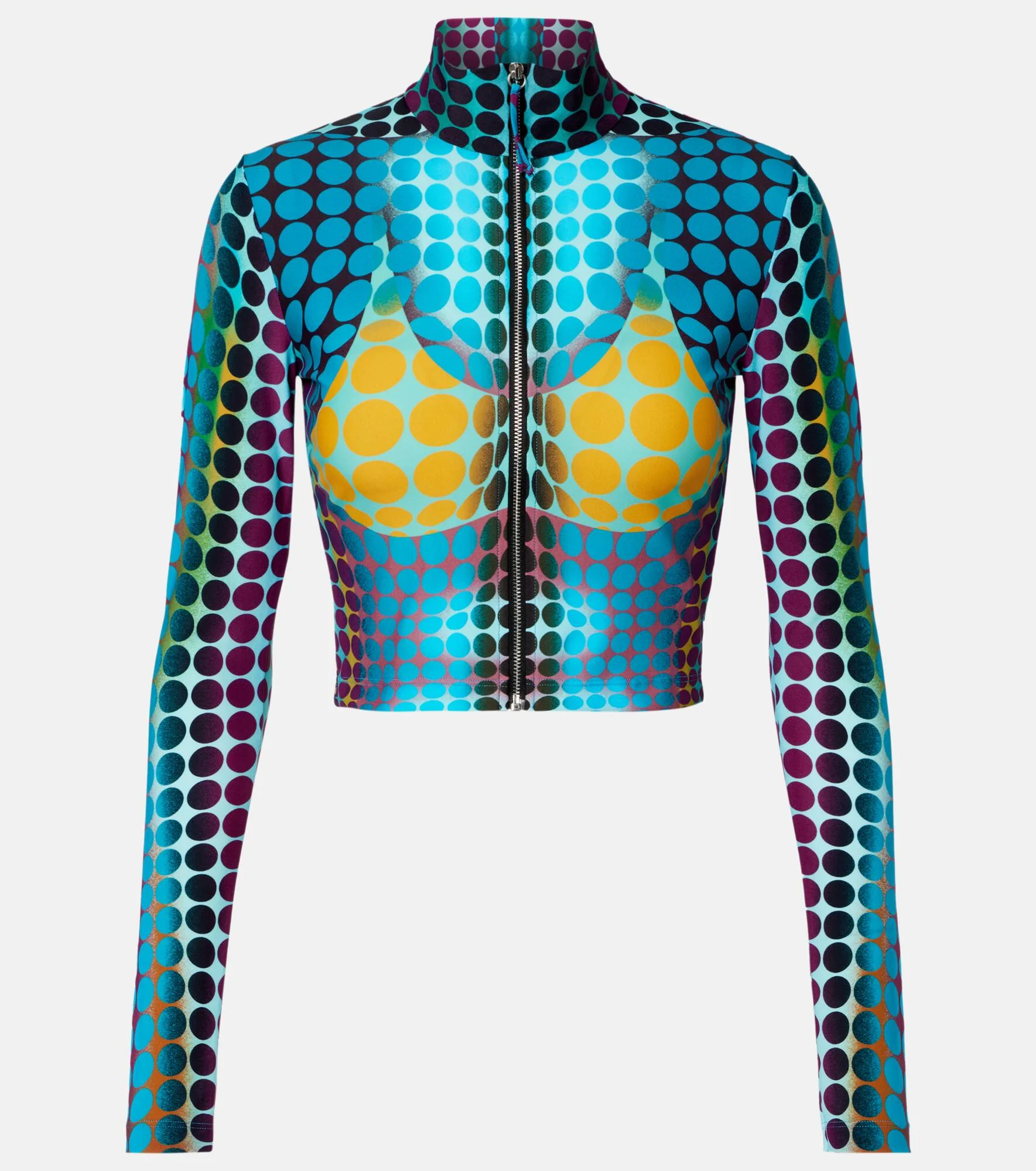 Dubbed fashion's “enfant terrible”, Jean Paul Gaultier hails the renaissance of vintage style codes through pop culture-inspired designs. This long-sleeved top is a Re-Edition of a classic and features an allover abstract print. Product Details - Material: 80% polyamide, 20% elastane - Care instructions: machine wash at 30 degrees - Made in Italy - Designer color name: Blue/Purple/Yellow - Item color: multicolor - Closure: zipped front - Item number: P01113333 Size & Fit - True to size - Fitted - Stretchy fabric - Cropped - The model seen in the picture is 178cm-5'10" and wearing a size XS