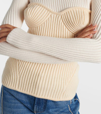 Dubbed fashion's “enfant terrible”, Jean Paul Gaultier hails the renaissance of vintage style codes through pop culture-inspired designs. Featuring a corset-inspired overlay, this ribbed-knit sweater is made from a wool blend and complete with a turtleneck. Product Details - Material: 96% wool, 4% polyamide - Care instructions: hand wash - Made in Italy - Designer color name: White/Ecru - Item color: white - Collar: turtleneck - Padded cups - Item number: P01072599 Size & Fit - True to size - Fitted - Stretchy fabric - Falls to the hip - The model seen in the picture is 178cm-5'10" and wearing a size XS