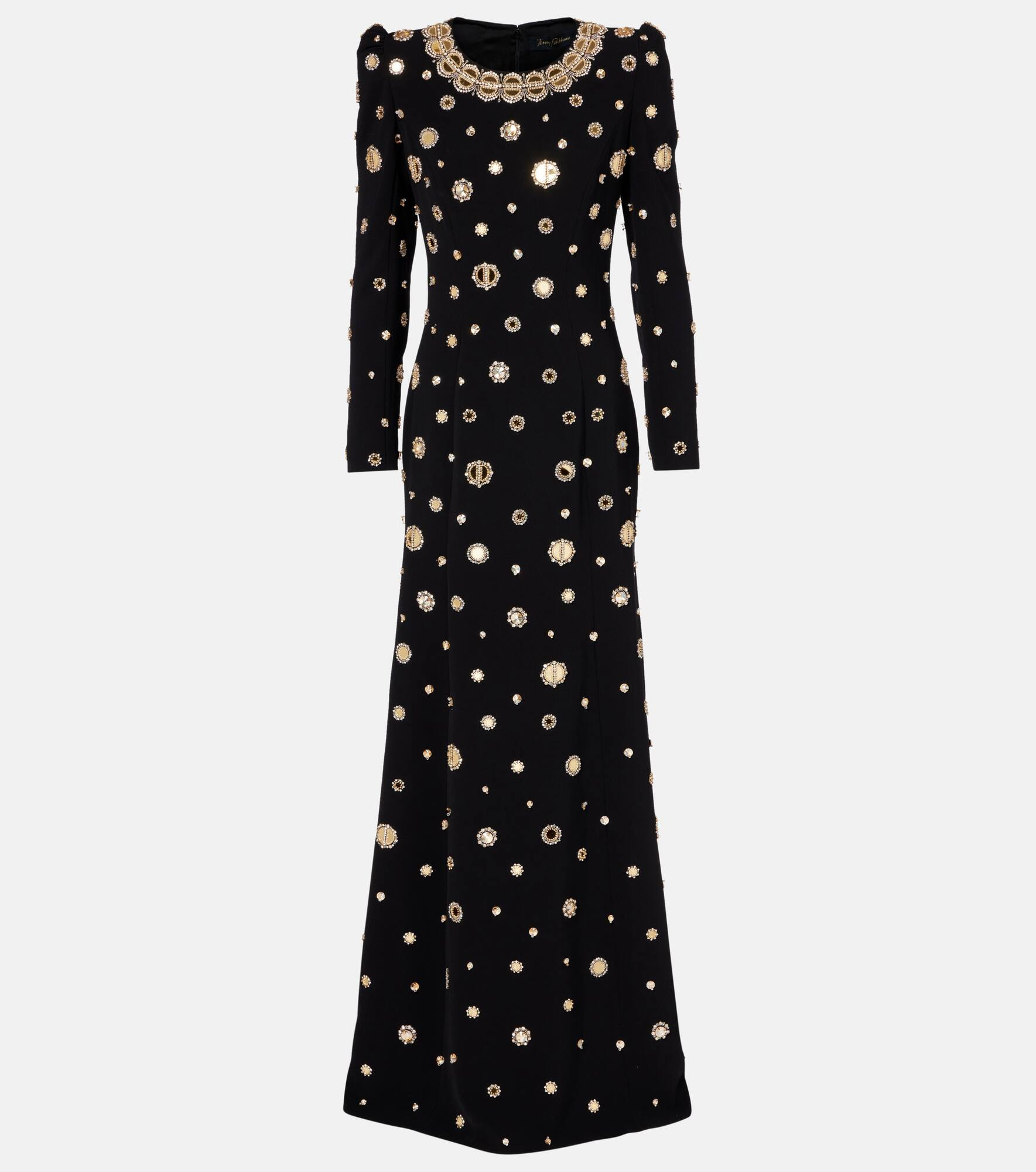 Enriched with romance, Jenny Packham’s intricately embellished designs are made to make an entrance. The Frency gown is defined by padded shoulders and shimmering details along the collar and silhouette, creating a striking contrast. Product Details - Material: 92% polyester, 8% polyurethane - Care instructions: dry clean - Made in India - Designer color name: Liquorice - Item color: black - Hardware color: rose gold - Lining: 100% polyester - Shoulder pads - Cuff: zipped - Closure: concealed zipped back, hook-fastening back - Item number: P01077521 Size & Fit - True to size - Shoulder pad inserts - Fitted - Non-stretchy fabric - The model seen in the picture is 178cm-5'10" and wearing a size UK 8