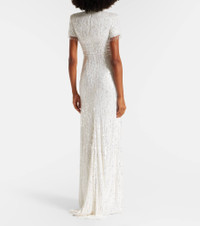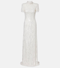 Enriched with romance, Jenny Packham’s intricately embellished designs are made to make an entrance. Complete with all-over embellishments, the Madeleine gown is a floor-sweeping piece with a mockneck, shoulder pads, and zipper fastening at the back. Product Details - Material: 100% nylon - Care instructions: dry clean - Made in the UK - Designer color name: Ivory - Item color: white - Lining: 95% polyester, 5% elastane - Collar: mockneck - Shoulder pads - Closure: zipped back - Hem: uneven - Item number: P01090520 Size & Fit - True to size - Oversized shoulders - Shoulder pad inserts - Fitted - Non-stretchy fabric - The model seen in the picture is 178cm-5'10" and wearing a size UK 8