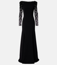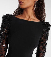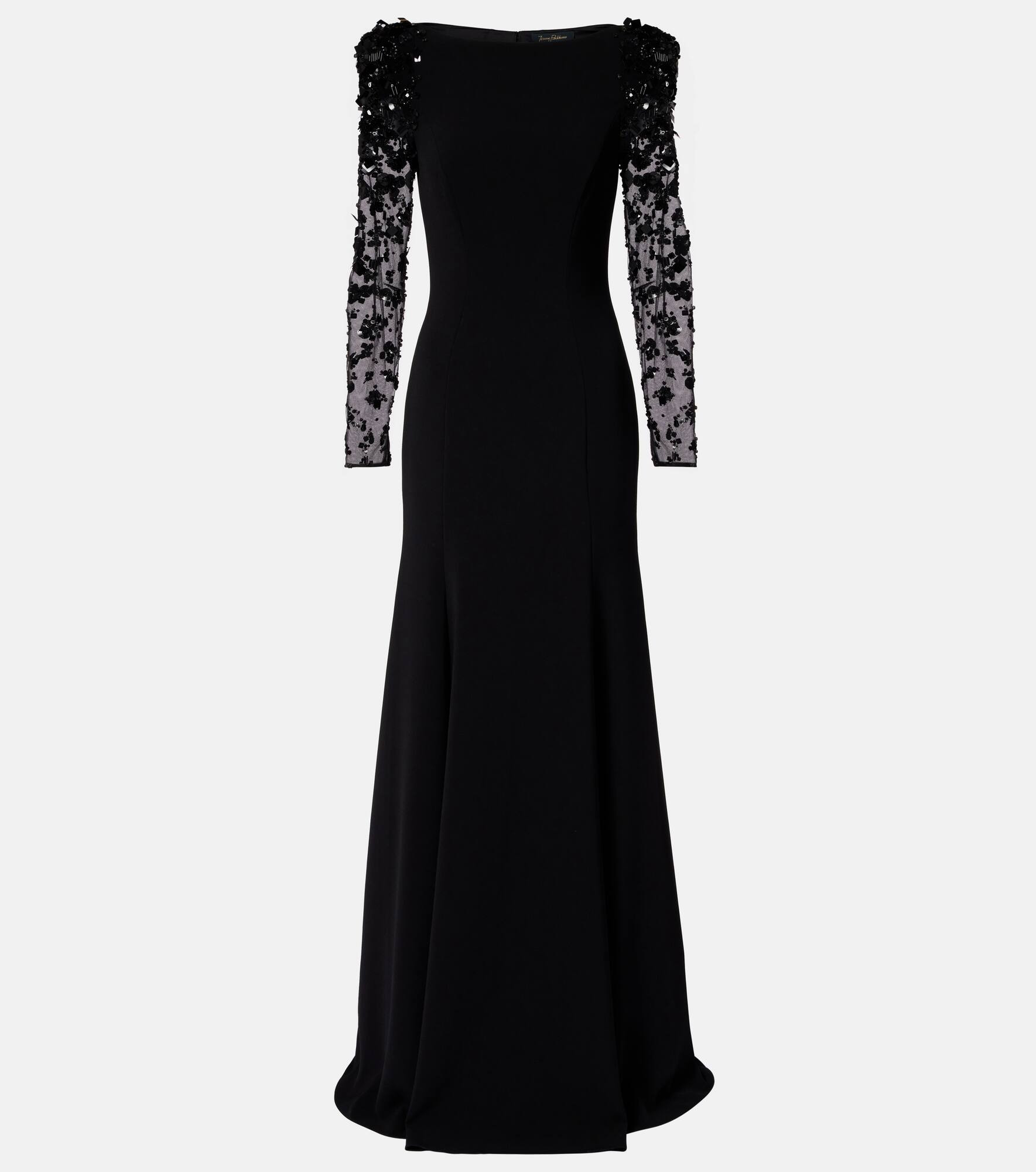 Primed for galas, special events, and more, the Sylvia gown from Jenny Packham features an elegant boat neckline, a fitted bodice, and a soft A-line skirt. The style is complete with sheer sleeves embellished with exquisite floral ornaments. Product Details - Material: 92% polyester, 8% polyurethane - Care instructions: specialist clean - Made in China - Designer color name: Liquorice - Item color: black - Lining: 100% polyester - Closure: zipper fastening - Item number: P01048223 Size & Fit - True to size - Shoulder pad inserts - Cinched waist - Stretchy fabric - The model seen in the picture is 178cm-5'10" and wearing a size UK 8